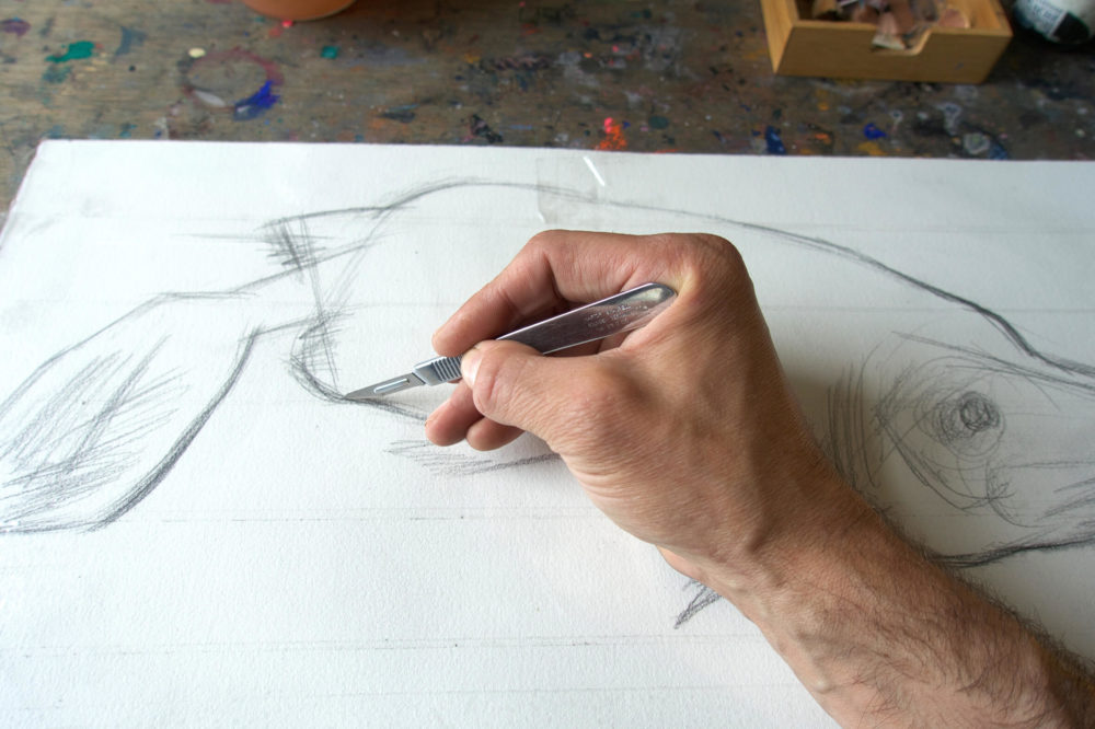2. Jetzt braucht man ein scharfes Skalpell oder einen Cutter. Beim Herausschneiden des Motivs sollte man gut aufpassen und nicht zu eifrig aufdrücken. Sonst passiert es leicht, dass Sie nicht nur durch das Klebeband schneiden, sondern auch das Papier zerschneiden. Deshalb ziehe ich es vor, für das Maskieren mit Klebeband ein starkes Aquarellpapier von 300 g/m² oder noch dicker zu nehmen … denn sicher ist sicher!