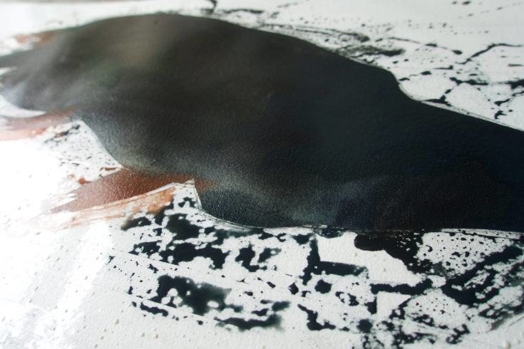 4. Wenn die erste Farbschicht ganz trocken (wichtig!) ist, trage ich die zweite, helle Schicht auf. Eine Mischung von Weiß und Cyan Blau kommen großzügig und mit viel Wasser auf den dunklen Hintergrund. Danach lasse ich das Wasser – zum Teil auch unkontrolliert – über das Bild laufen. Jetzt wieder schön trocknen lassen.