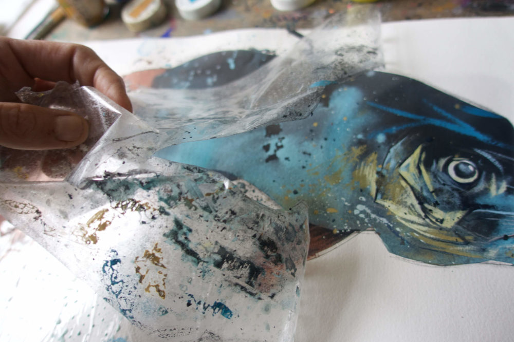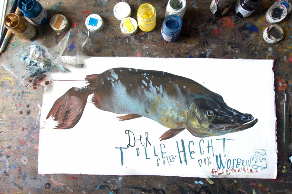 5. Jetzt ist der Hintergrund soweit vorbereitet und es kann an die Details gehen. Ich arbeite mich an dem Auge, dem Mund mit kleinen Zähnchen und den Kiemen voran. Ganz helle Lichtreflexe kommen zu guter Letzt auf die Fischschnauze. Jetzt geschieht das Spannendste – die Klebeband-Maskierung kann endlich ab!