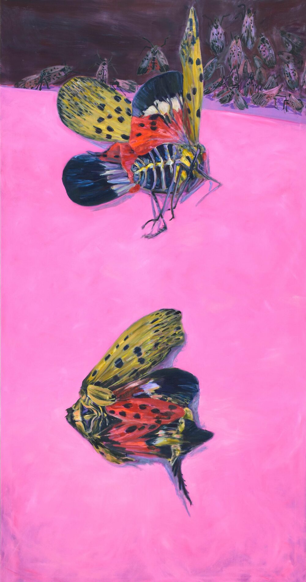 Im Oktober 2023 besuchte ich New York City anlässlich einer von einem Freund kuratierten Beckmann-Ausstellung in der Neuen Galerie. In dieser Zeit sah ich zum ersten Mal diese seltsamen Insekten „Spotted Lanternflies“:* Wie bunte Klecksmuster lagen hunderte von ihnen am Morgen zertreten auf den Bürgersteigen. Faszinierend und fremd in Größe, Form und Farbe, mit schillernd roten Flügeln und gelb-schwarzer Unterseite fielen sie mir direkt ins Auge und blieben in meinem Gedächtnis. Die New Yorker versuchten sie zu zertreten, denn sie sind eine aus Asien eingeschleppte Zikadenart, die, vom Licht angezogen, nachts ganze Schaufenster belagert. Ein seltsames Bild: wunderschöne Schädlinge.
