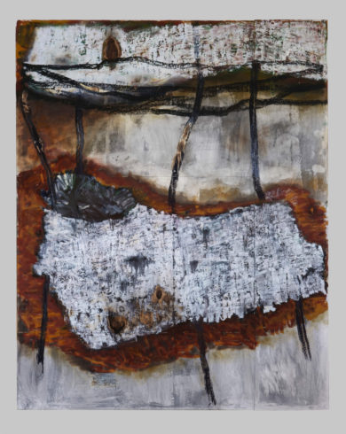 Schweres, großformatiges Kupferdruckbütten auf Holz appliziert, hauptsächlich bearbeitet mit breiten Oilsticks und Feuer, wird zum reliefartigen Bildträger mit Brandrändern und -verletzungen.