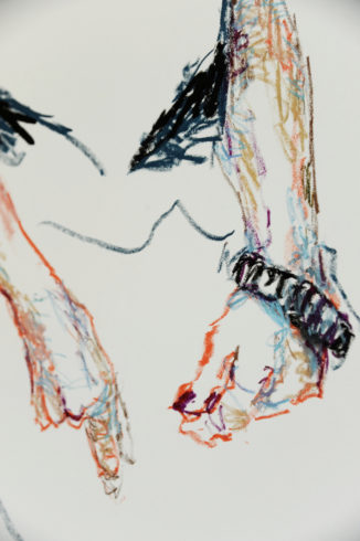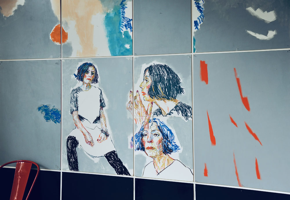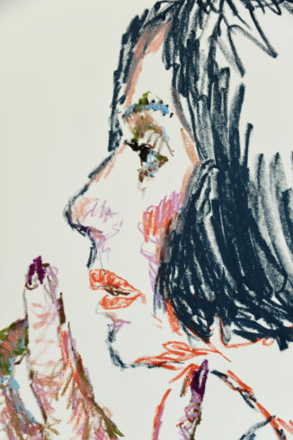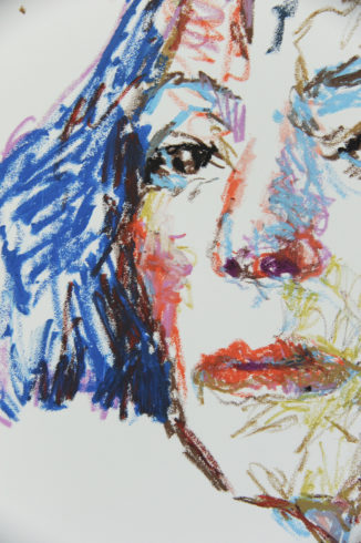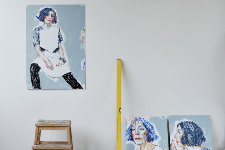 Die Porträts – ganzfigurig und im Detail – sind in Ölpastell und Acrylfarbe für Hintergründe und Farbflächen in lockerem, expressivem Auftrag ausgeführt. Die kraftvolle, teils mehrfarbige Behandlung einzelner Partien sorgt für Ausdruck und Licht. Aufgrund ihres geringen Gewichts können die Werke im Anschluss allein mithilfe kleiner Nägel gehängt werden. Da sie in diesem Beispiel nicht auf Stoß montiert sind, hat sich die Anordnung mithilfe einer Wasserwaage an einer unteren, exakt waagerechten Linie orientiert.