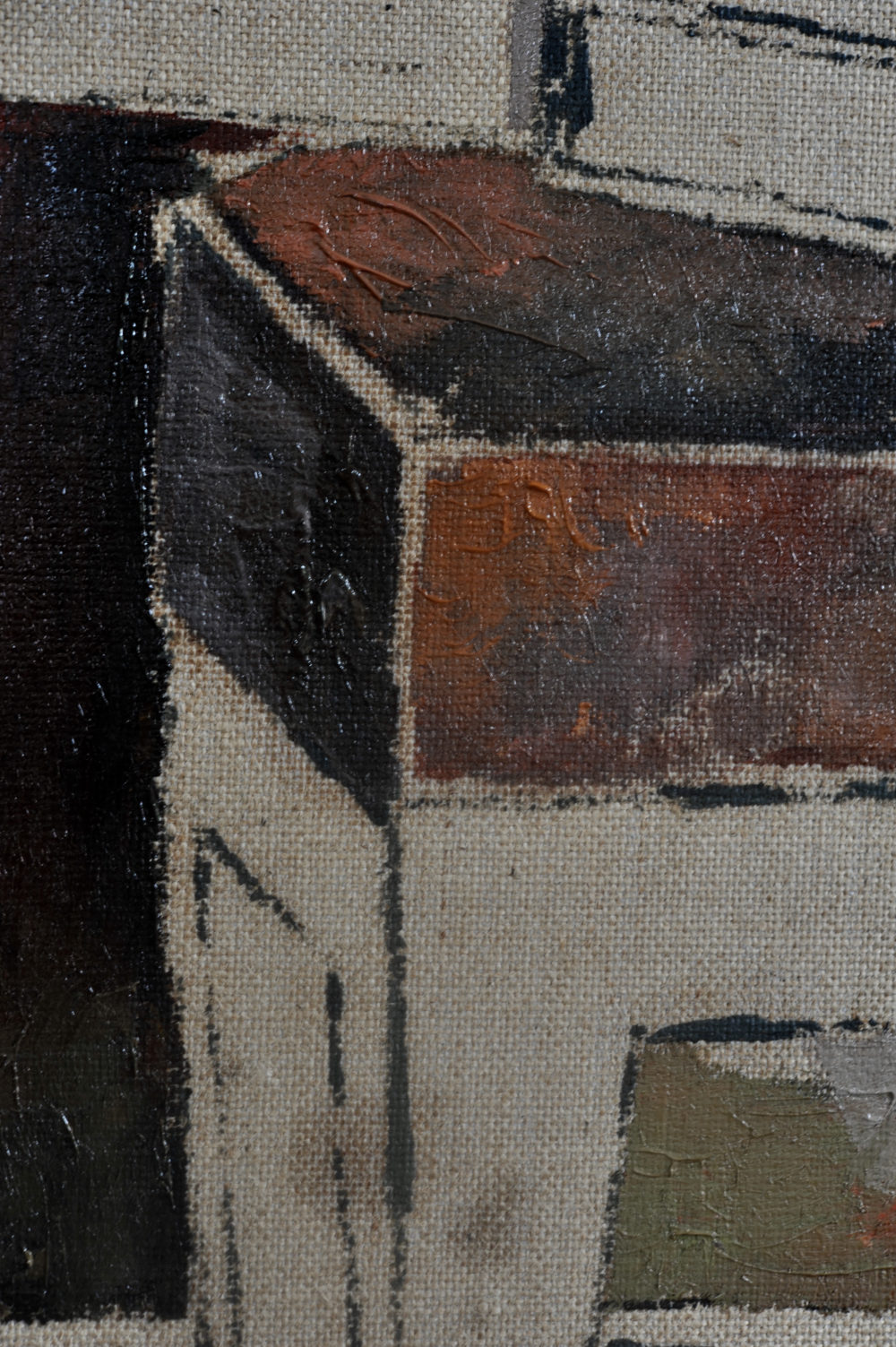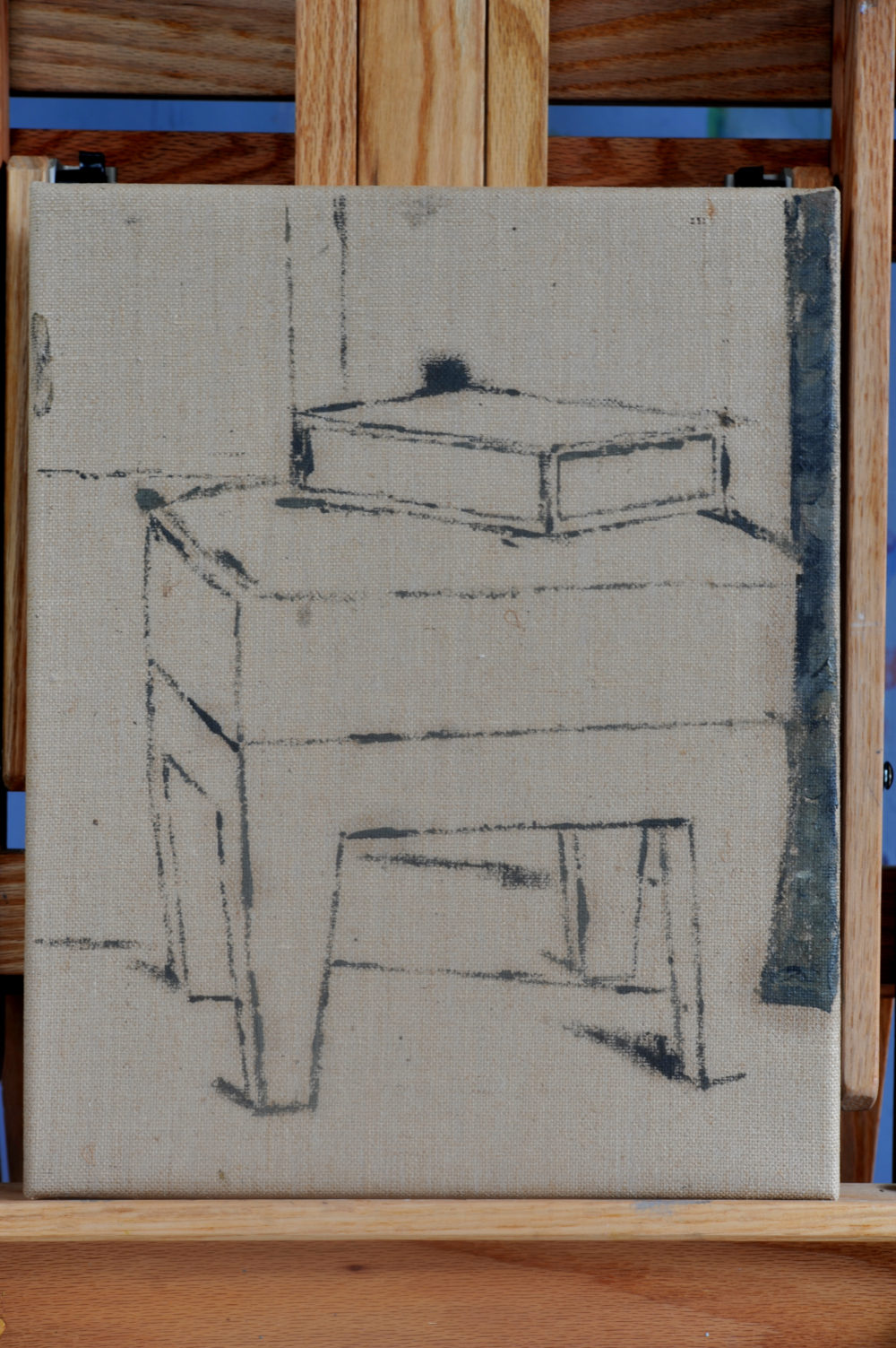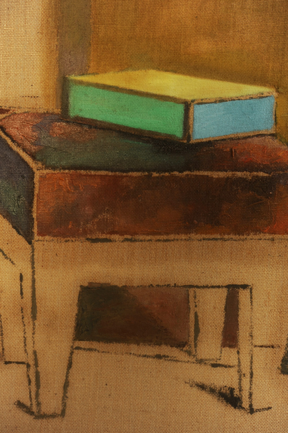 Eigenes Leuchten: Bei diesem Work-in-progress geht es um den koloristischen Aspekt, der die Farben zum Strahlen bringt. Das Werk ist in Ocker- und Brauntönen angelegt. Allein die auf dem Hocker liegende Schachtel vereint mit Grün, Blau und Ocker drei Farben, denen die nahezu monochrome Haltung Strahlkraft verleiht.