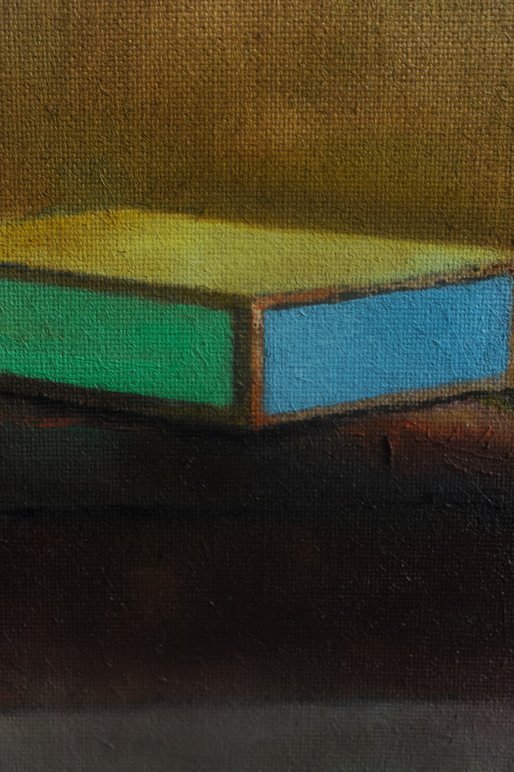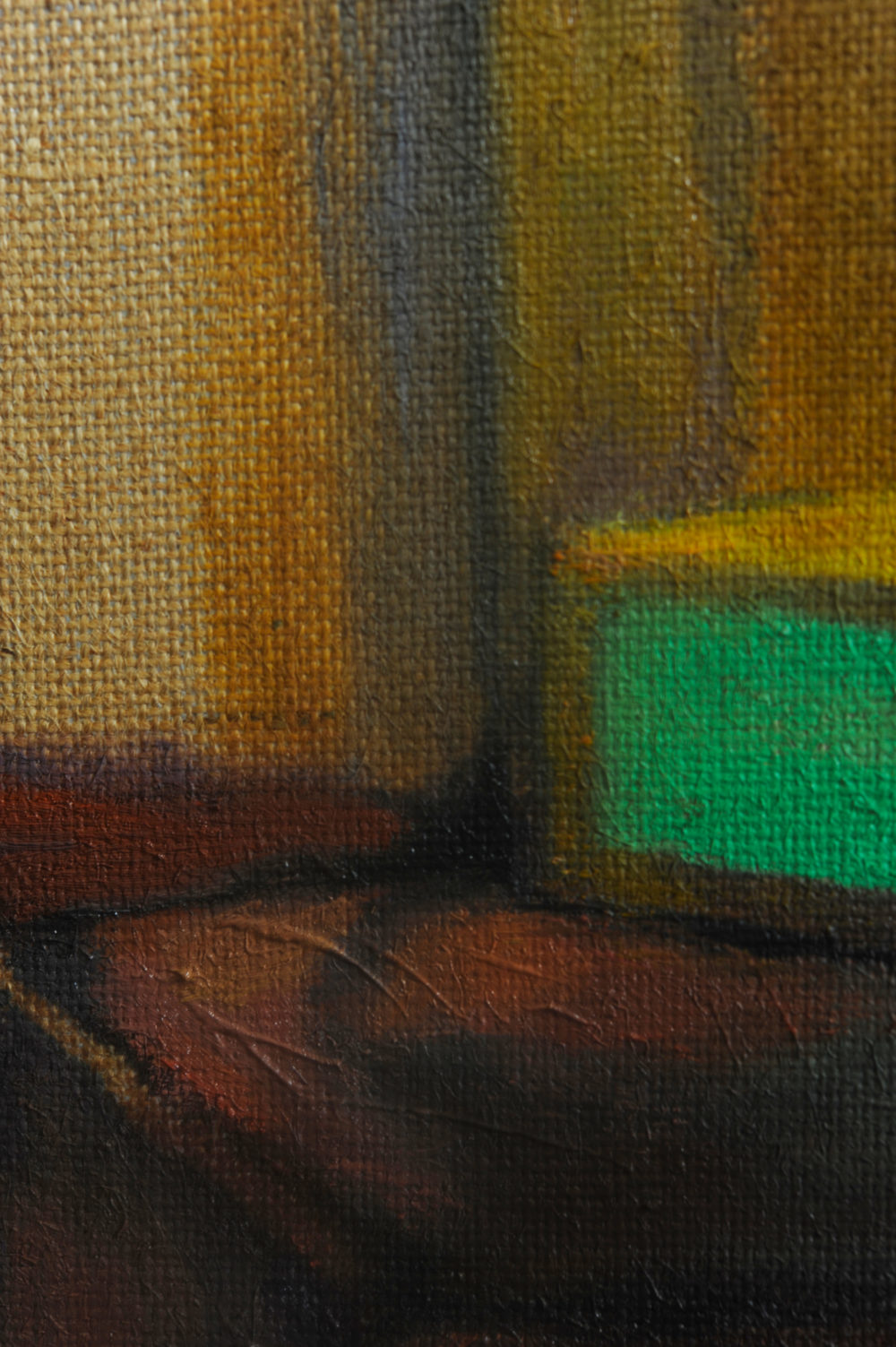 Im Detail wird deutlich, dass erst die dunkle Farbumgebung das Grün der Schachtel richtig zum Leuchten bringt. Die naturbelassene, ungrundierte Leinwand ist bereits Träger des ockrigen Tons und gibt gewissermaßen eine Richtung vor.