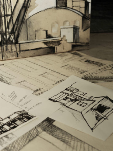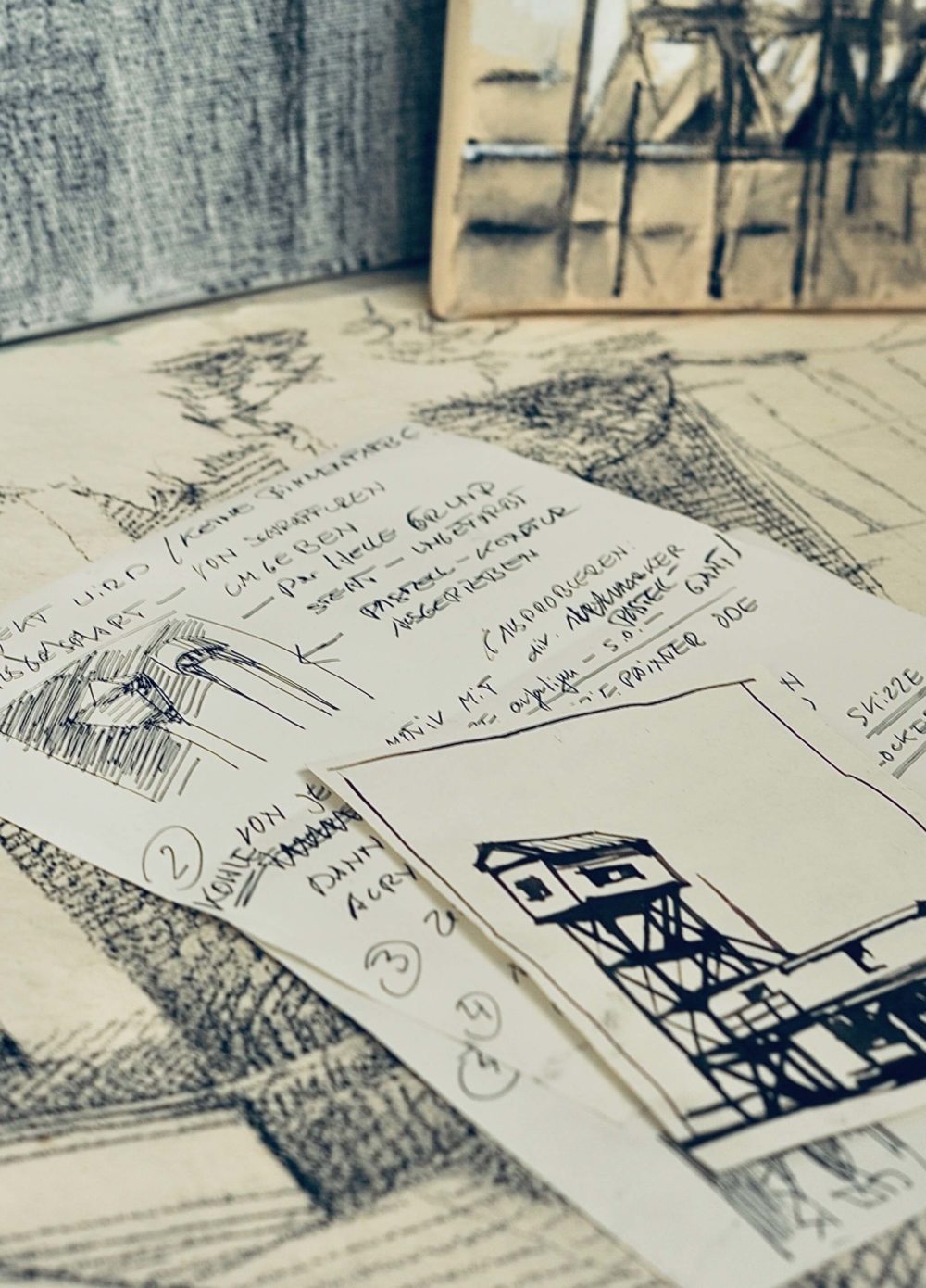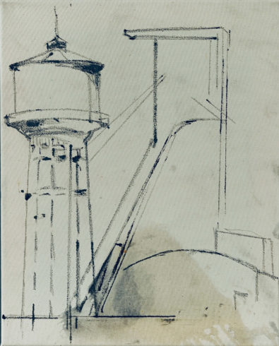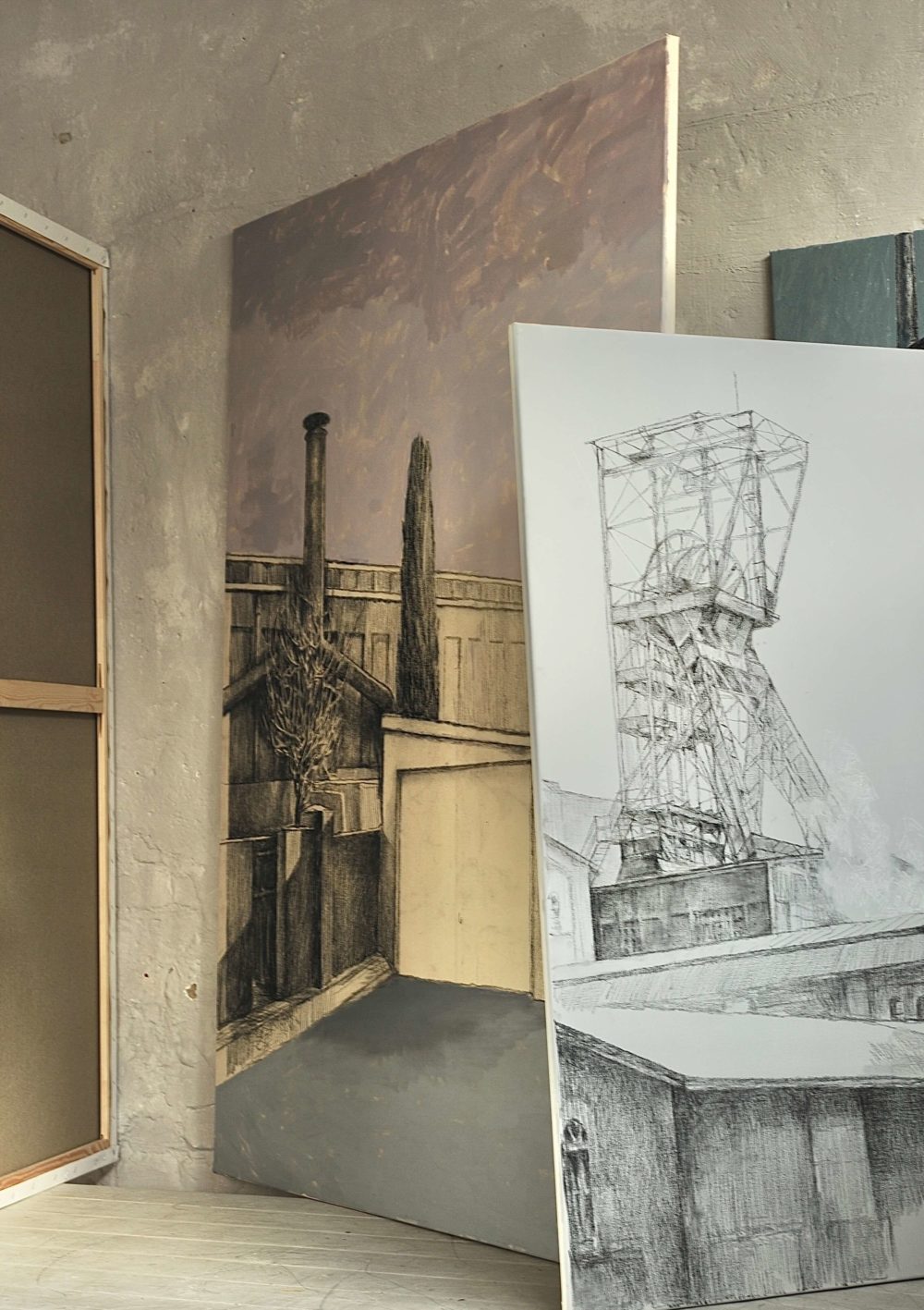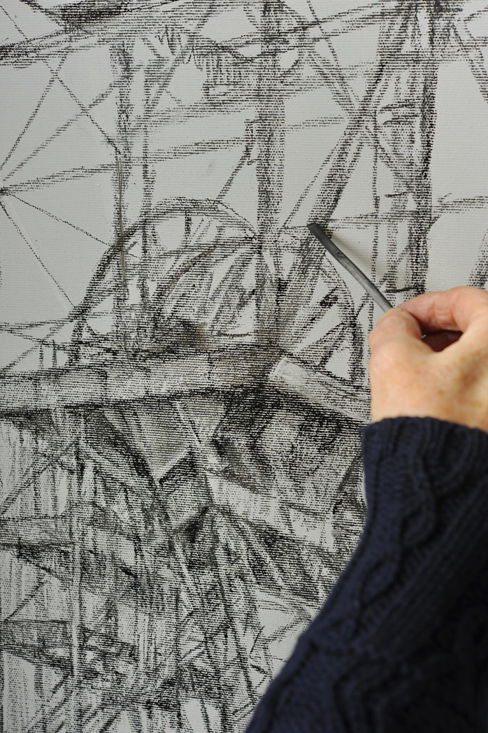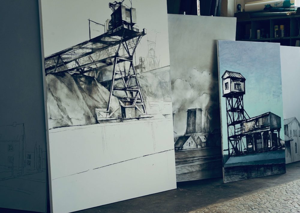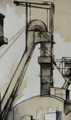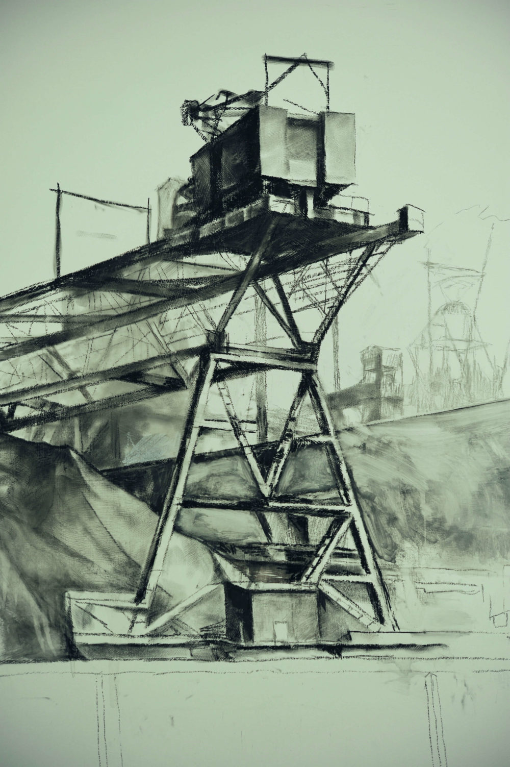 Leinwandgewebe mit einer dünnen, hellen Gouache- Grundierung trägt hingegen den Förderturm und sorgt für die technisch anmutende Wirkung der reinen Kohlezeichnung. Dank der unterschiedlichen Stärken der Kohlestäbchen lassen sich feine Schraffuren ebenso erzeugen wie flächige Effekte.