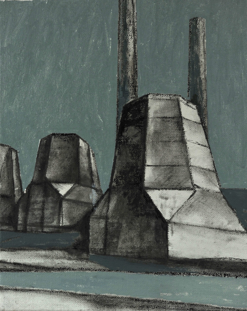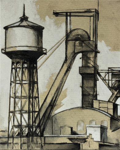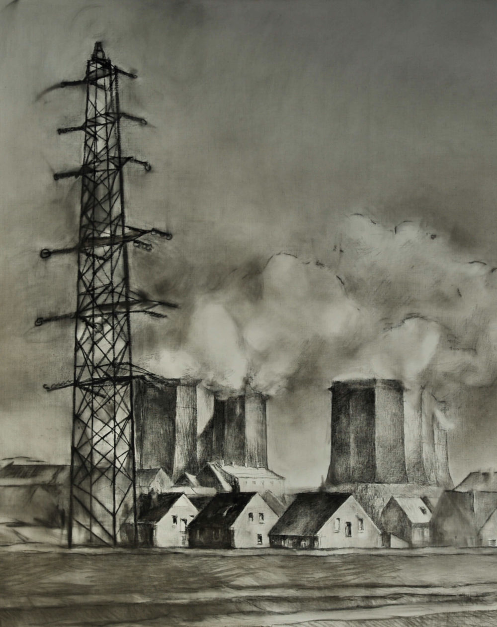 Industriegebäude an der Ruhr standen Pate für diese zeichnerischen Umsetzungen, die sich in Kohle, Pastell und Kreiden auf Struktur und Tonigkeit konzentrieren. Licht und Schatten spielen selbstverständlich dabei eine besondere Rolle, da sie die Monumentalität des Motivs betonen und herausarbeiten. Damit korrespondiert die Schlichtheit des Untergrunds: Die teils großformatigen Zeichnungen entstanden auf geleimtem Baumwollgewebe, das an manchen Stellen bewusst genutzt wird und papierfarben durchscheint, oder weiß bzw. hell grundierter Leinwand. Die Wahl der zeichnerischen Mittel ist dabei mitentscheidend für die Wirkung: Der Förderturm wurde mit der Bruchkante von portugiesischer Art-Graf-Kreide in nass gearbeitet, während zahllose feine Kohleschraffuren die Flächigkeit der Schlote rechts erzielen.
