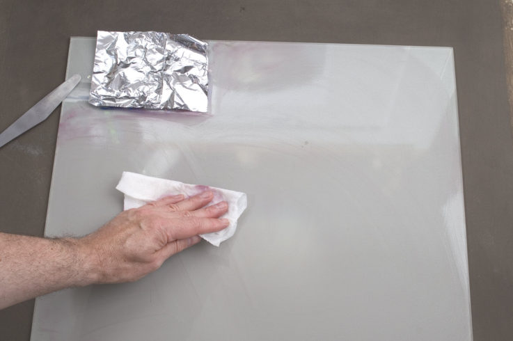 Wenn Sie Ihre Palette mit Seife und Wasser reinigen, empfehle ich für das Atelier eine wasserfeste Palette auf dem Tisch. Eine auf der Rückseite grau grundierte Glasplatte (4-5 mm stark) ist die beste Mischunterlage. Sie können die Rückseite der Platte mit Acrylfarbe oder Plakafarbe bestreichen. Der Grauton sollte neutral und nicht zu dunkel sein.