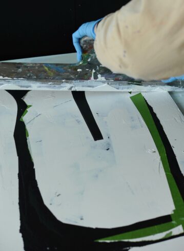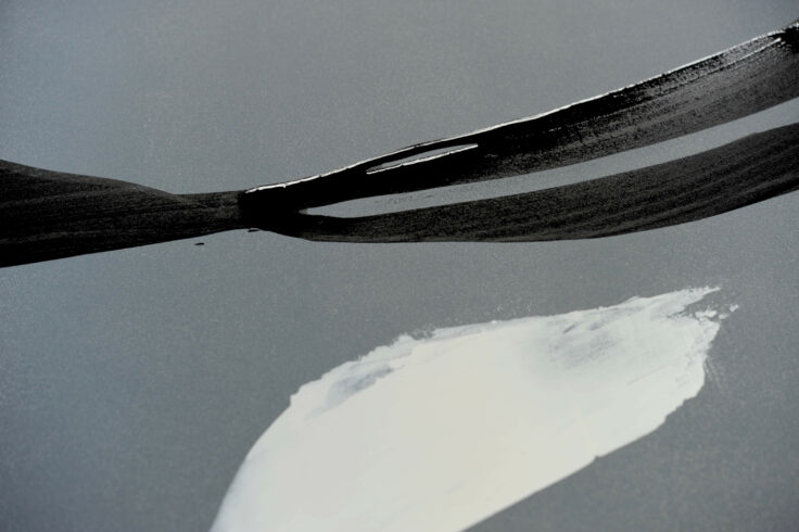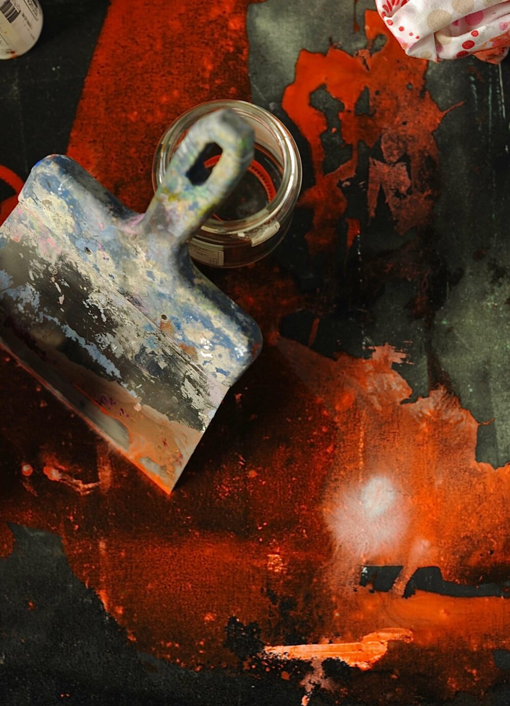 Die Rakeltechnik ist immer auch ein Experiment mit Konsistenzen: Während zähflüssig-pastose Farben der Rakel mehr Widerstand entgegensetzen, haben fließendere Farben ein leichteres Spiel. Für die Arbeit mit der Rakel eignen sich dementsprechend sowohl Öl- als auch Acrylfarben, doch auch Lacke bieten überraschende Effekte.