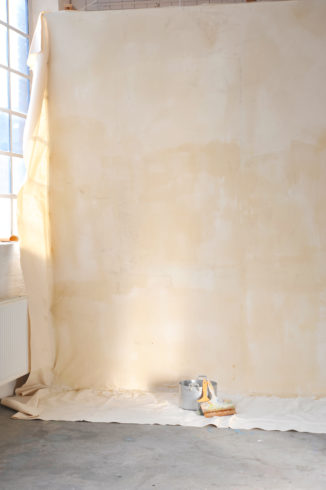 maßgeblich mitbestimmt. Da das Rohgewebe „Arles“ in der Bearbeitung deutlich schrumpft, sollte es rundum gut und in kleinen Abständen mit Nägeln oder Tackerklammern befestigt werden – hier im Format 3 x 3 Meter auf der Wand (zu deren Schutz Plastikfolie untergespannt wurde). Ein entsprechend großer Keilrahmen tut natürlich ebenfalls gute Dienste. Leimfarben in einer Mischung aus Leim und Pigment waren die Farben der Wahl, deren matter Charakter dem Ausdruck der Freskomalerei nahekommt.