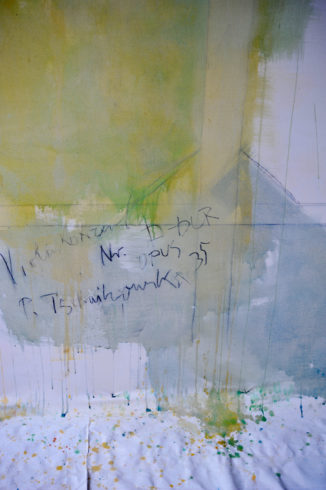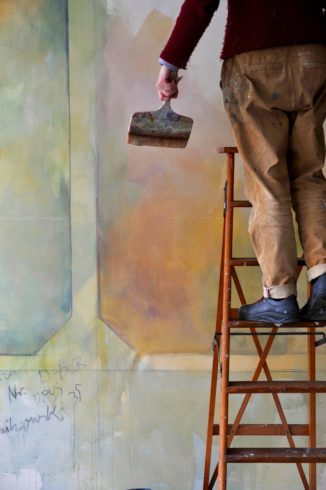 Diesen Freskocharakter auf Baumwollgewebe zu übertragen war in der hier gezeigten großen Malerei das Ziel, das die Auswahl der Grundierung und der Farben