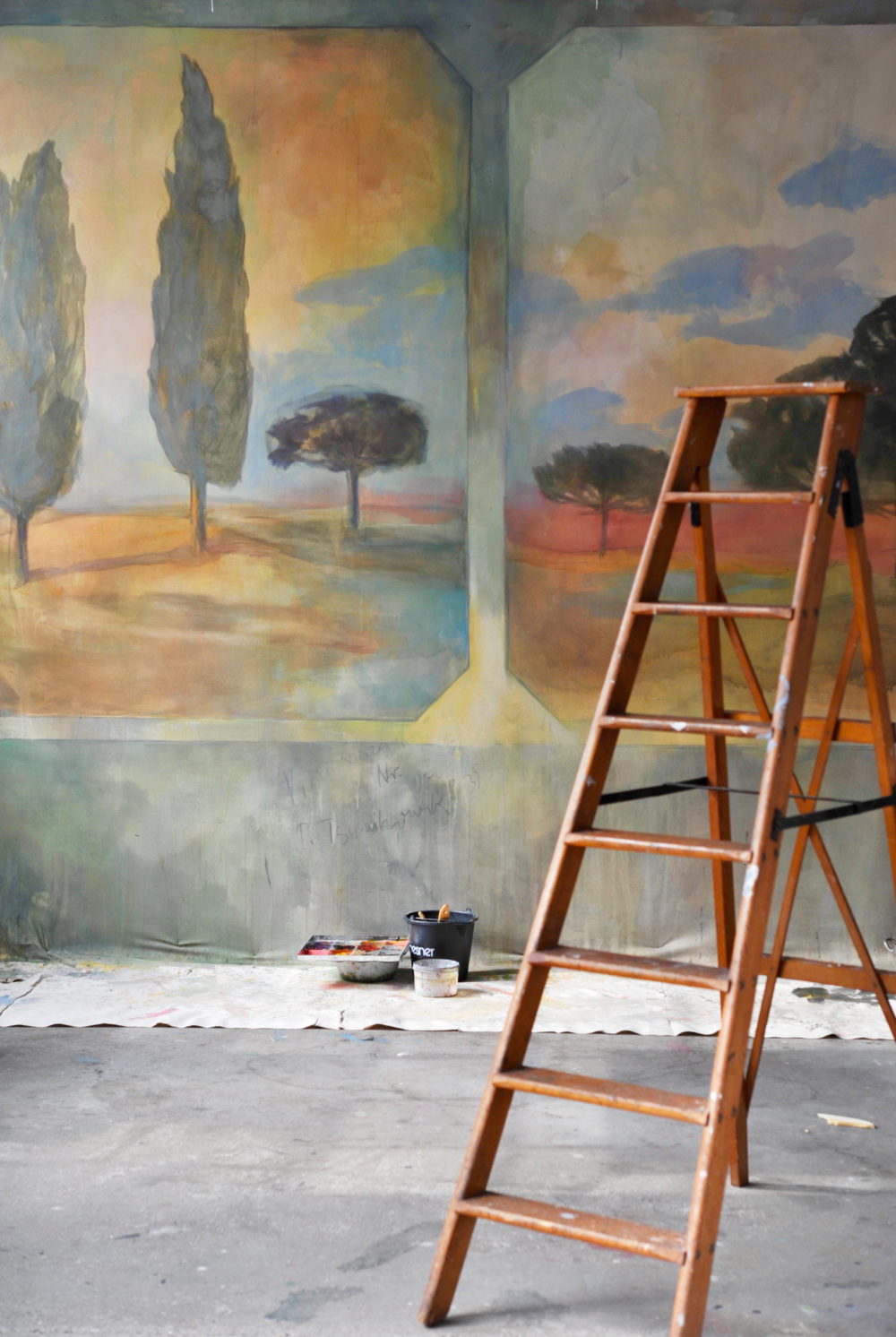 Dünne Farblasuren strukturieren zunächst den Bildraum, im Anschluss konturiert die Anlage der Freskenfelder die zu bearbeitende Fläche. Für die toskanisch anmutende Landschaftsdarstellung werden die mit einem breiten Pinsel aufgetragenen Farben – eine Mischung aus Leim und Pigment – bei bestimmten Farbtönen für den luftigen Charakter mit Weißpigment gehöht.