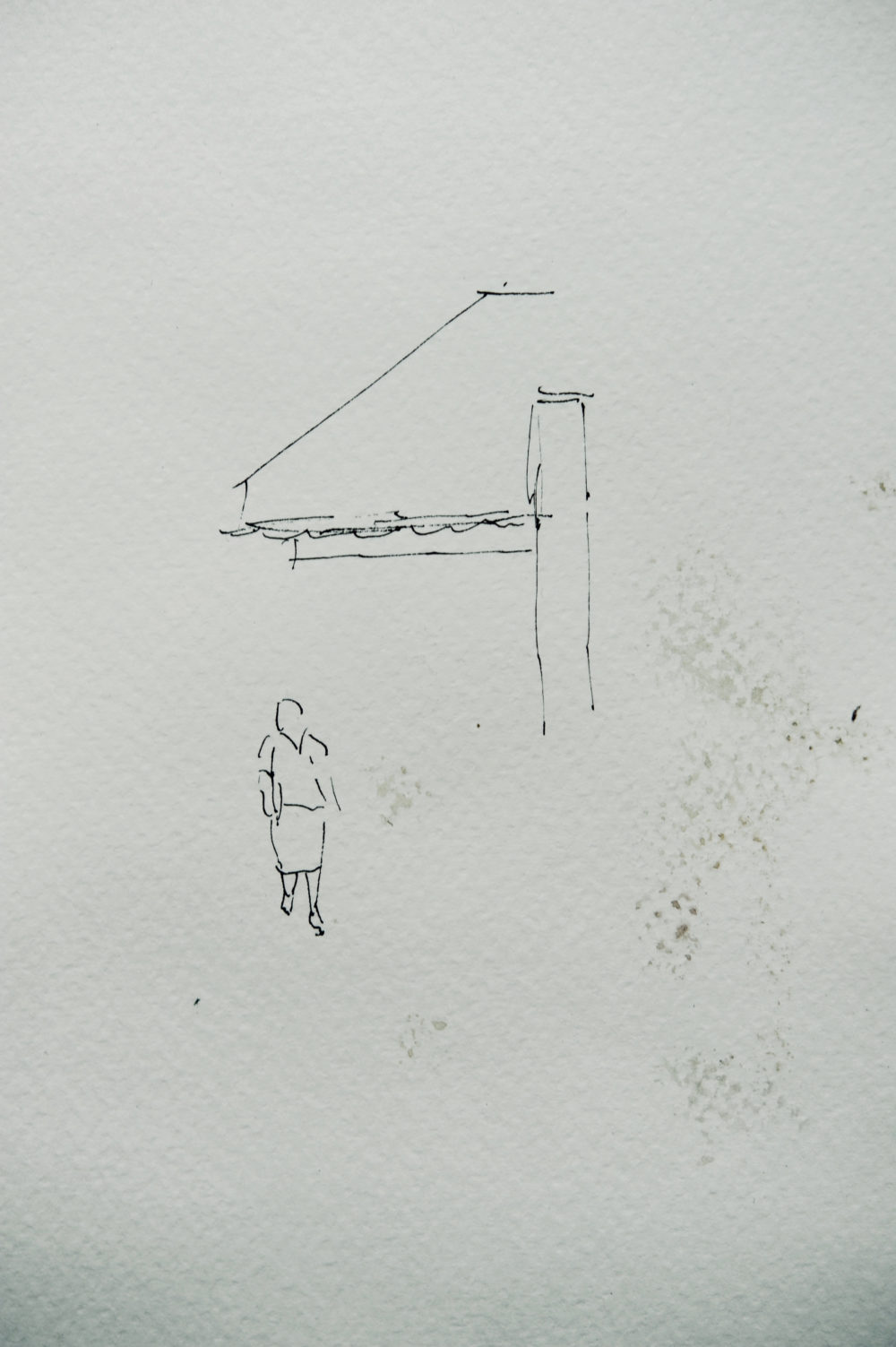 Eine minimale aquarellierte Lavierung erzeugt zum Abschluss die atmosphärische Tonigkeit des Raums.