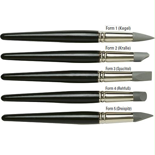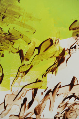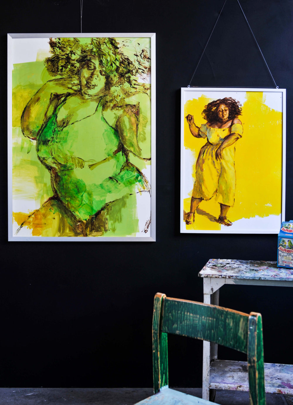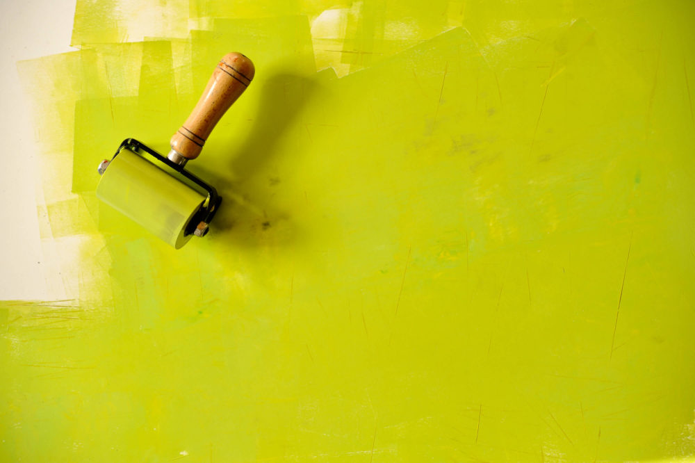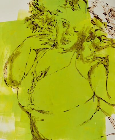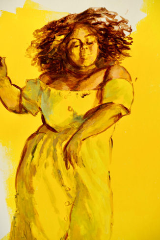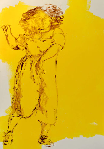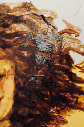 In diesem Beispiel mit seiner modernen, plakativen Optik wurde zunächst eine pastose Acrylfarbe mit einer Gummiwalze glatt und nicht flächendeckend als Hintergrund auf eine grundierte Pappwabenplatte aufgetragen. Der Zusatz von Malmittel bei der figürlichen Darstellung sorgt dann für eine geschmeidigere Konsistenz derselben Farbe, die zudem nicht sofort in die Grundierung einzieht: Im Motiv kann sie so in schneller Technik mit dem Art Modelleur, einem pinselähnlichen Malwerkzeug mit fester Gummispitze, geformt werden. Ohne Pinselspuren „verdrängt“ der Art Modelleur gewissermaßen an diesen Stellen die Farbe, sodass neben verdichteten Strecken auch nahezu transparente Partien und Linien entstehen.