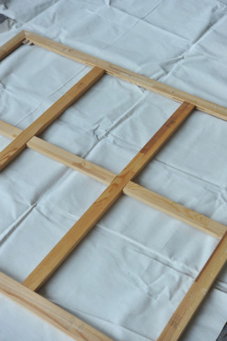 Der Keilrahmen wird möglichst fadengerade auf das Gewebe aufgelegt, bevor es – je nach Stärke der Keilrahmenschenkel – mit einer Zugabe von mindestens 8 Zentimetern zurechtgeschnitten wird. Im Anschluss wird es locker und mit Spielraum positioniert, an den Kanten und Ecken umgeschlagen und auf der Rückseite festgetackert.