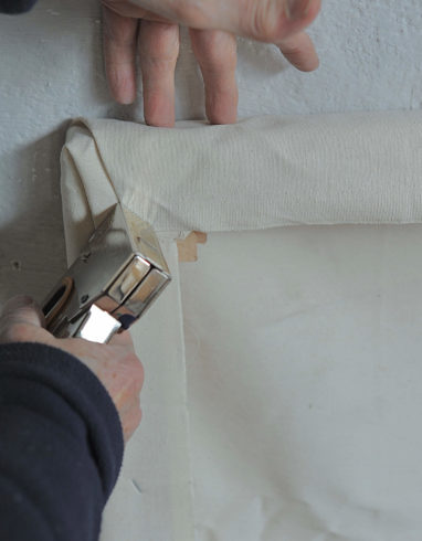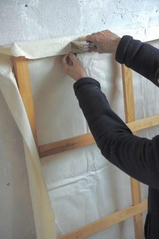 Beim Aufspannen von Leinen- oder Baumwollgeweben auf Keilrahmen ist Fingerspitzengefühl gefragt, wenn das Gewebe durch eine Leimung vorbereitet werden soll: Es kommt auf die Spannung an!