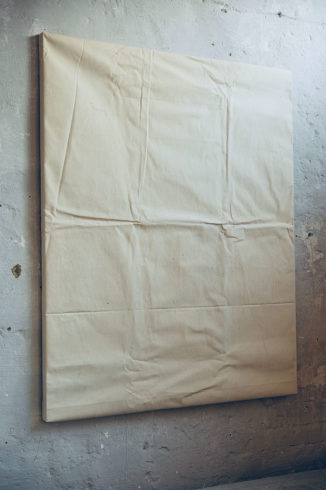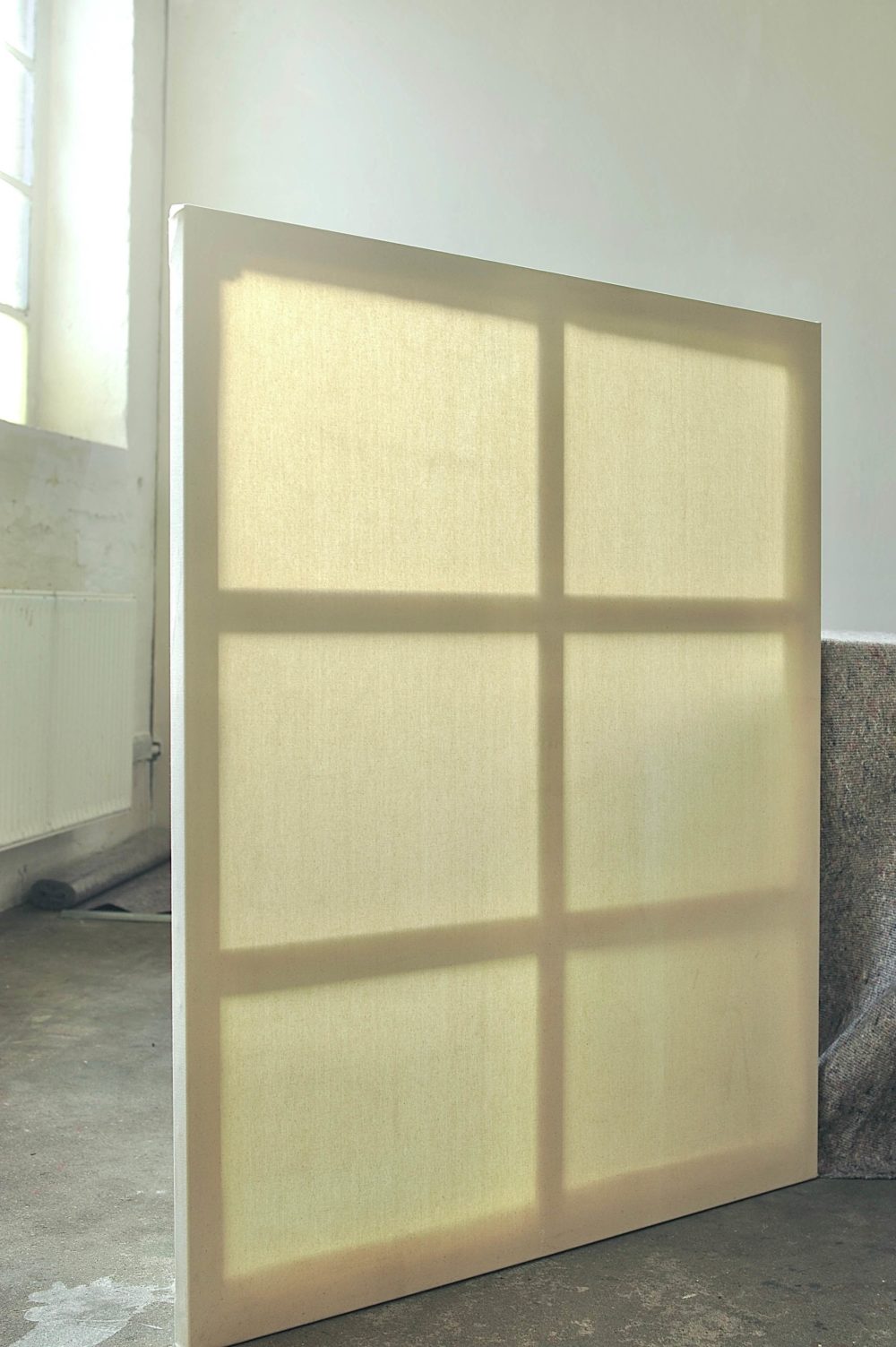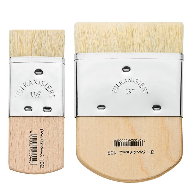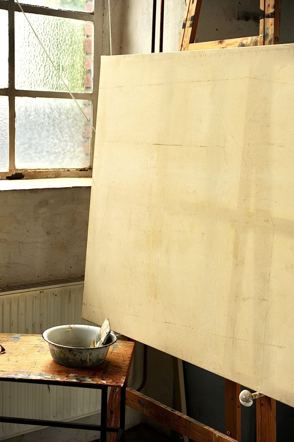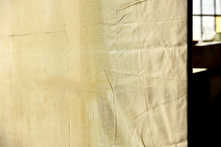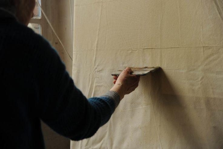 Mithilfe eines Flach- oder Paddle-Pinsels wird die Leimlösung gleichmäßig und vollflächig auf die Leinwand aufgetragen. Wenn der Trocknungsprozess dem Leim allmählich das Wasser entzieht, schrumpft die Leimschicht: Das Gewebe strafft sich und besitzt in trockenem Zustand eine deutliche Transparenz im Gegenlicht.