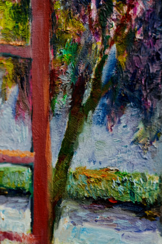 Der pastose Auftrag der Ölfarbe erlaubt feinste Nuancierungen, mit denen sich der koloristische Aspekt allmählich ändert. Zugunsten einer offeneren Raumwirkung verschwindet die Leseleuchte unter einem helleren Grau, auf das auch Fensterrahmen und Vorhang antworten. Die Struktur des Gartens wird in den Flächen und mit der teilenden Hecke definiert, Schatten und Sonnenflecken nachmittäglichen Lichts erobern den Raum. Die Blüten des Baumes wandeln sich schließlich in dichtes Laubwerk, und die neue spätsommerliche, warmtonige Farbigkeit setzt sich im Innenraum fort: Die Fensterrahmen sind in der abschließenden Fassung rotbraun, der rote Boden nimmt diese Farbgebung auf.