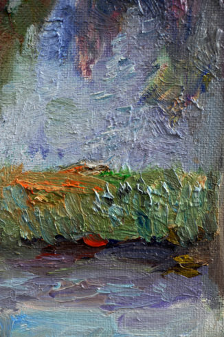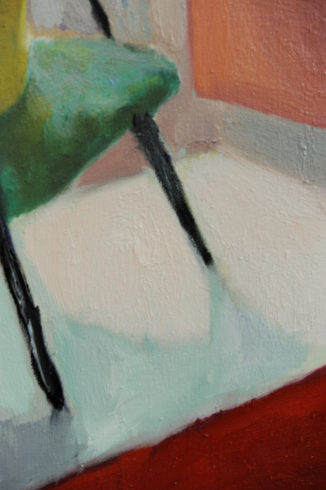 Werk im Wandel: Das Ölbild eines Gartenzimmers mit Ausblick in die Natur durchläuft verschiedene Phasen, die in den einzelnen Arbeitsschritten deutlich werden. Die Vorzeichnung in Kohle legt das Sujet fest: Eine Interieurszene mit Ausblick in die Natur. Der rechte Flügel einer Glastür eröffnet den Blick in den Garten. Vor dem geschlossenen linken Flügel ist eine gelbe Tasche auf einem grünen Sessel abgestellt, der offenbar als Leseplatz gedacht ist, denn hinter ihm steht eine Leseleuchte. Allmählich differenziert sich die Farbigkeit von Zimmer und Garten: Der Baum zeigt sich mit hellrosa Blüten frühlingshaft, der Durchgangsbereich präsentiert sich mit weißem Boden, Fensterrahmen und Vorhang sind dunkel gefasst.