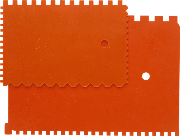 Spachtel zum Auftragen von Klebern oder für Spezialeffekte. Zwei Ausführungen: klein/vierseitig gezahnt und groß/zweiseitig gezahnt.