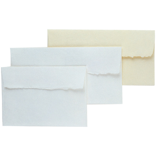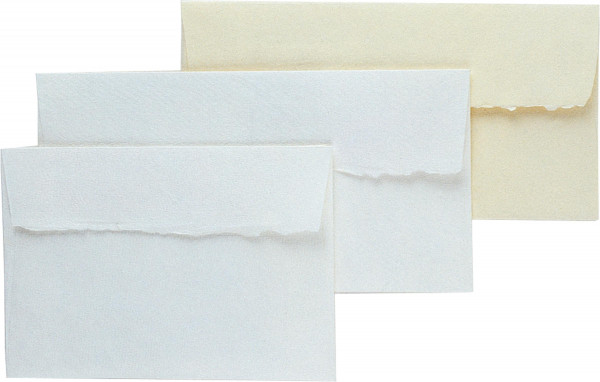 Handgeschöpfter Büttenumschlag aus 100 % Baumwolle, ohne Gummierung, matte Oberfläche, Verschluss mit sichtbarem Büttenrand. Komplett handgefertigte Kuverts in Paketen à 10 Stück zu einem sensationellen Preis. Bei Naturpapieren sind leichte Farbabweichungen möglich.