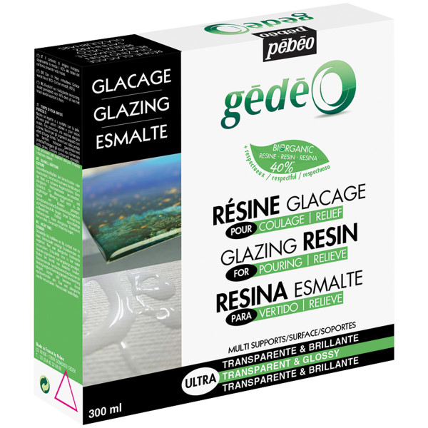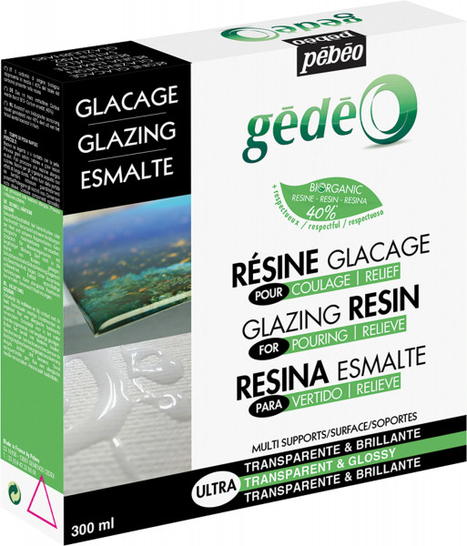 Das Zwei-Komponenten-Epoxidharz-System (Harz und Härter) mit biobasiertem Harz (Kohlenstoff auf Biobasis macht durchschnittlich 40 % des gesamten Kohlenstoffes im Harz aus) ist umweltfreundlicher als herkömmliche Gießharze. Beim Vergießen des halbflüssigen, transparenten, glänzenden Überzugharzes auf ebenen, waagerechten Flächen bilden sich abgerundete Kanten aus, ohne dass die Gefahr des Überlaufens besteht. Ideal zum blasenfreien Glasieren oder Gestalten von Relief- und Lupeneffekten auf Oberflächen wie Fotos, Postkarten oder Leinwänden. Das Harz bindet schnell ab, hat eine 30 % kürzere Trockenzeit und ist nach dem Trocknen hart, max. Schichtdicke: 1 cm. Besonders anwenderfreundlich. Mischungsverhältnis: 2:1 (2 Teile Harz, 1 Teil Härter).