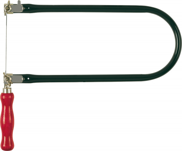Qualitäts-Laubsäge: feinlackiertes Buchenholzheft, gehärtete Schrauben, Stahlrohr 13 mm, schwarz lackiert, 300 mm Ausladung, Spezial-Spannplättchen, Stahlflügelmuttern.
