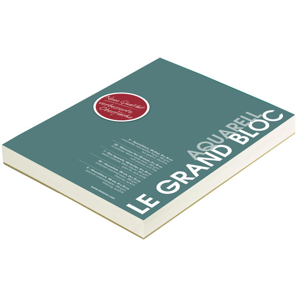 In einer Neuauflage gibt es die Aquarellausführung des beliebten Sortimentsklassikers „Le Grand Bloc“ jetzt mit optimierter Oberflächenstruktur. Der naturweiße französische Aquarellkarton (200 g/m²) ist einseitig geleimt und hat eine feine, mittlere Körnung. Er ist säurefrei, alterungsbeständig und für alle Nasstechniken wie Aquarell, Lavis, Gouache, Tempera und Acryl geeignet.