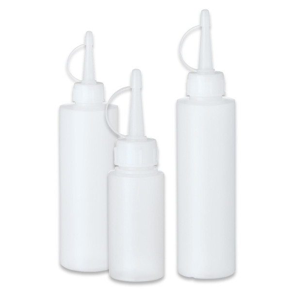 Runde, halbtransparente Leerflasche aus HD-Polyethylen zur Eigenabfüllung und Aufbewahrung von Flüssigkeiten und anderen Materialien. Die mitgelieferte Tülle hilft bei Entnahme und genauer Dosierung der gewünschten Inhaltsmenge.