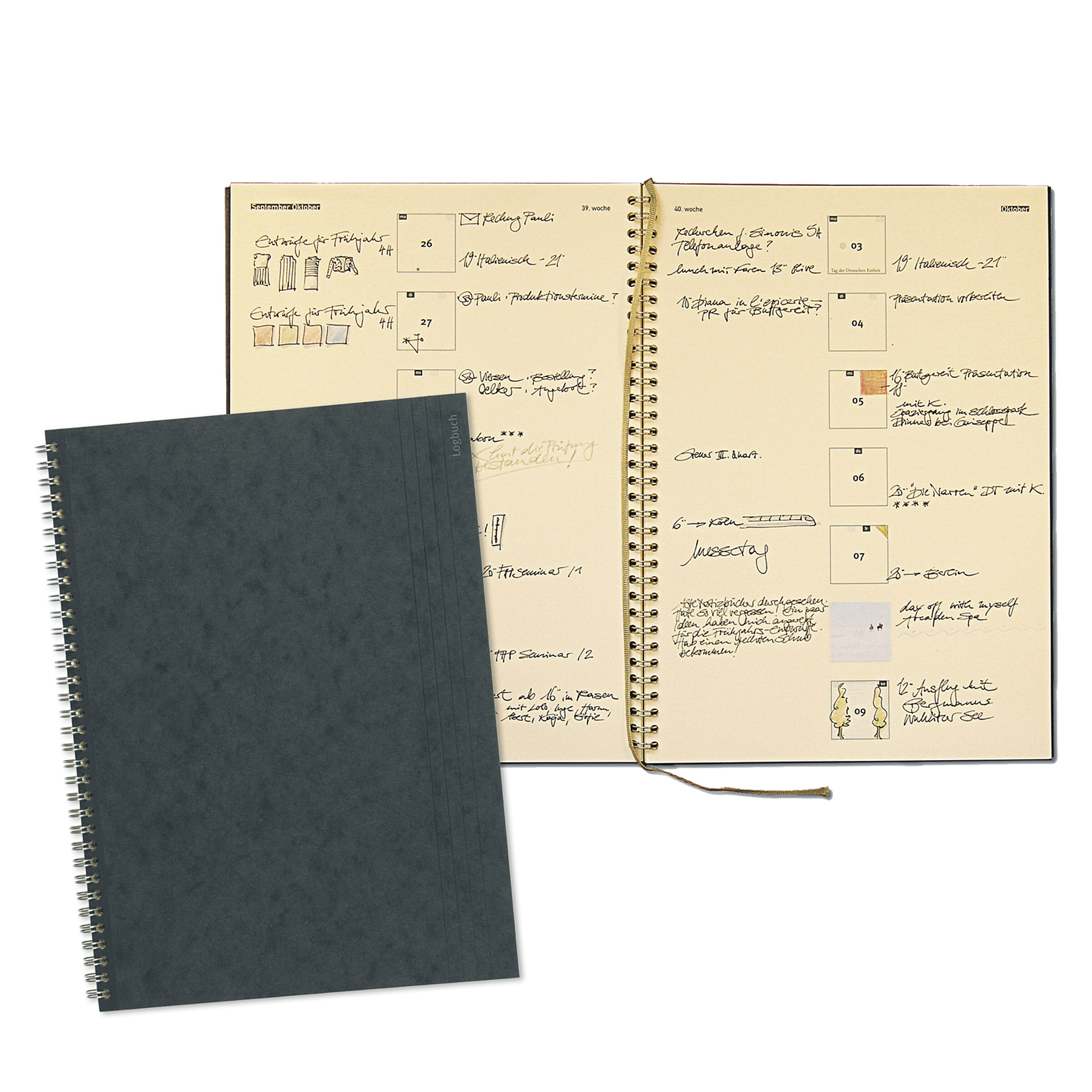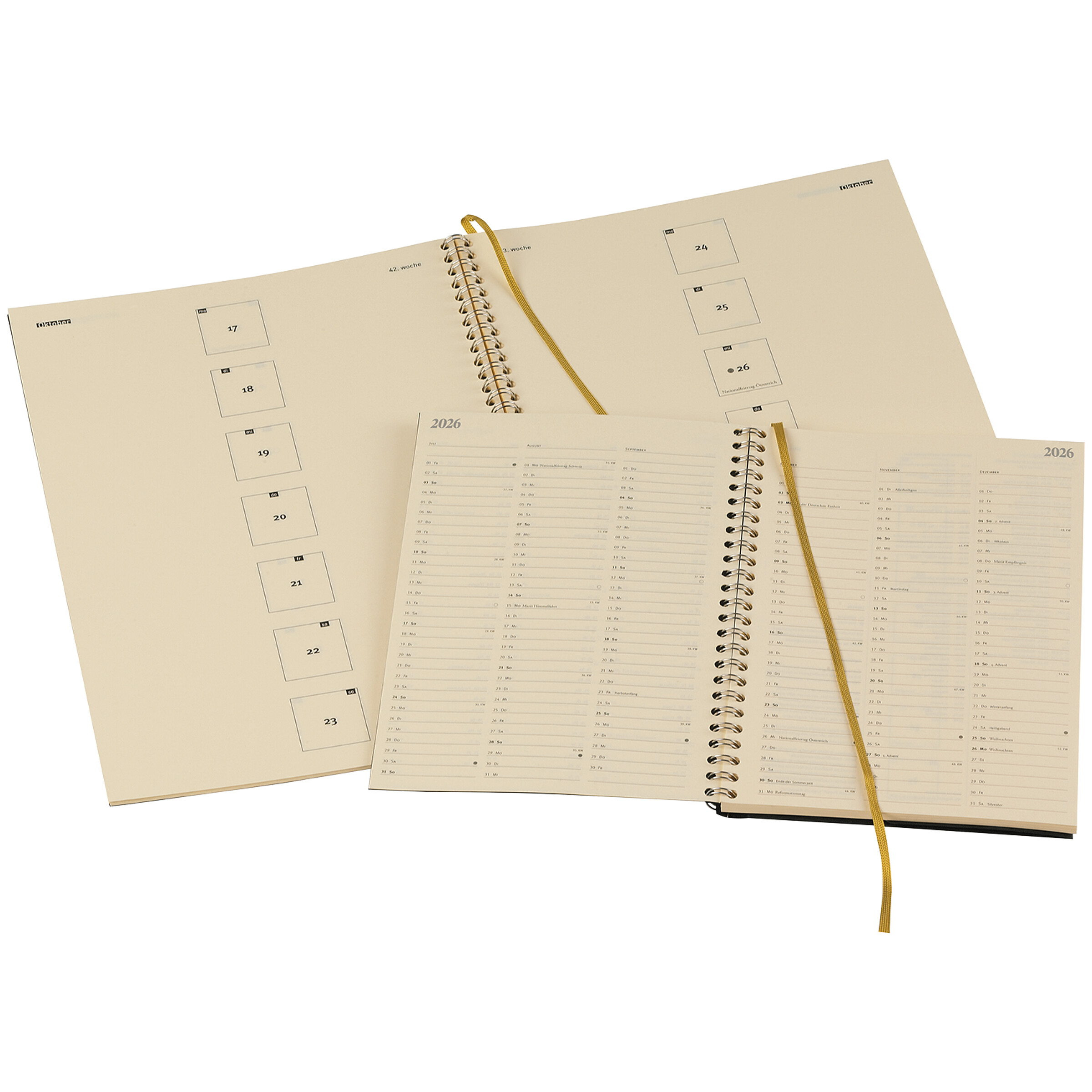 Terminplaner in DIN A4 und DIN A5. Mit viel Platz für die individuelle künstlerisch-kreative Gestaltung. Enthält eine Jahresübersicht für 2026 und 2027 sowie wissenswerte Termine im Anhang. Umschlag aus schwarz-gewolkten Karton (335 g/m²) und an der Bindeseite der Wire-O-Bindung mit schwarzem Leinenfälzel verstärkt. Umschlagrückseite mit Innenklappe für lose Blätter. 116 Seiten chamoisfarbenes Papier (80 g/m²), mit altgoldfarbenem Leseband.
