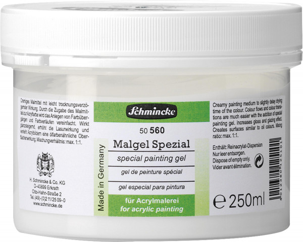Malgel Spezial wird der Acrylfarbe im Verhältnis 1:1 beigemischt. Die Farbe wird hierdurch etwas pastoser, lässt sich jedoch einfach und wie gewohnt mit normalen Acrylpinseln – bei etwas längerer Offenzeit – verarbeiten. Auf diese Weise lassen sich perfekte Farbübergänge (z. B. für die Gestaltung von Himmel, Wolken und Meer) und gleichmäßige Farbflächen erzielen.