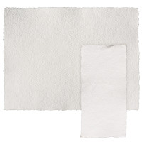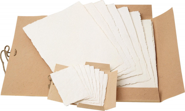 Die Mappe aus 100 % Baumwolle hat durch die Beigabe von getrockneter Baumrinde eine ungewöhnliche Struktur. Sie enthält zehn Bogen Aquarellpapier mit umlaufendem Büttenrand. Die Bogen werden im Nasszustand gerissen, pH-Wert 6–6,5, säurefrei.