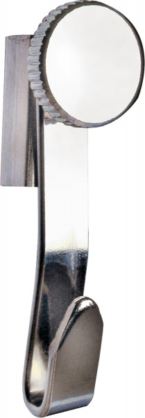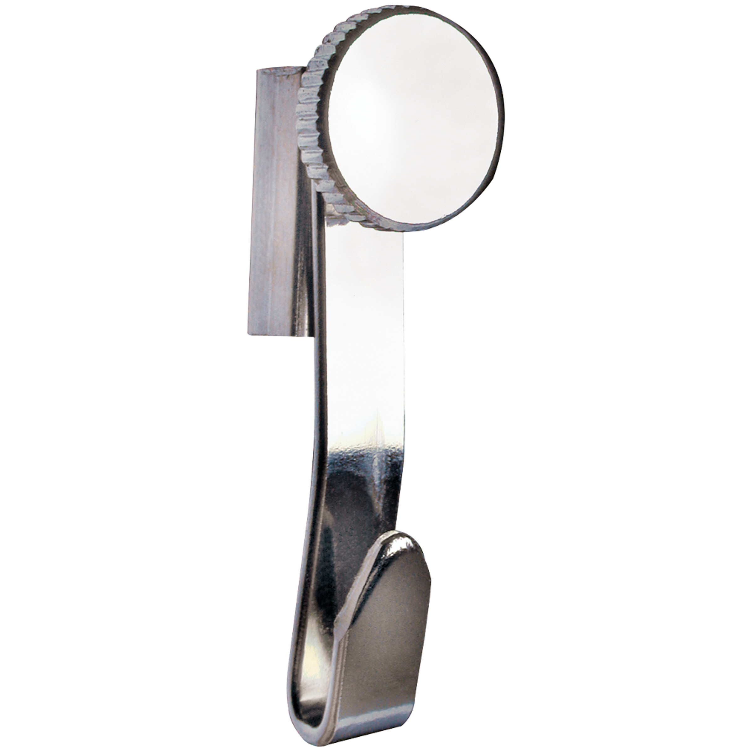 Verstellbarer Bildhaken. Liegt extrem flach an der Wand an. Tiefe 8 mm, Höhe 26 mm. Ideal für kleinere Bilder mit Niet- und Klappösen sowie für Aluminiumrahmen geeignet. Für Perlon- und Stahldrahtseile bis 2 mm Ø. Tragkraft bis ca. 2 kg.