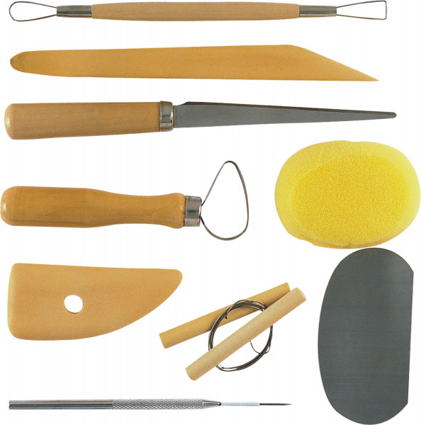 Das Set beinhaltet 1 doppelseitige Modellierschlinge (Länge ca. 20 cm), 1 große Modellierschlinge, Modellierholz, Schwamm, Holzspatel, Töpfermesser, Drahtschlinge, Metallspachtel und Graviernadel aus Metall.