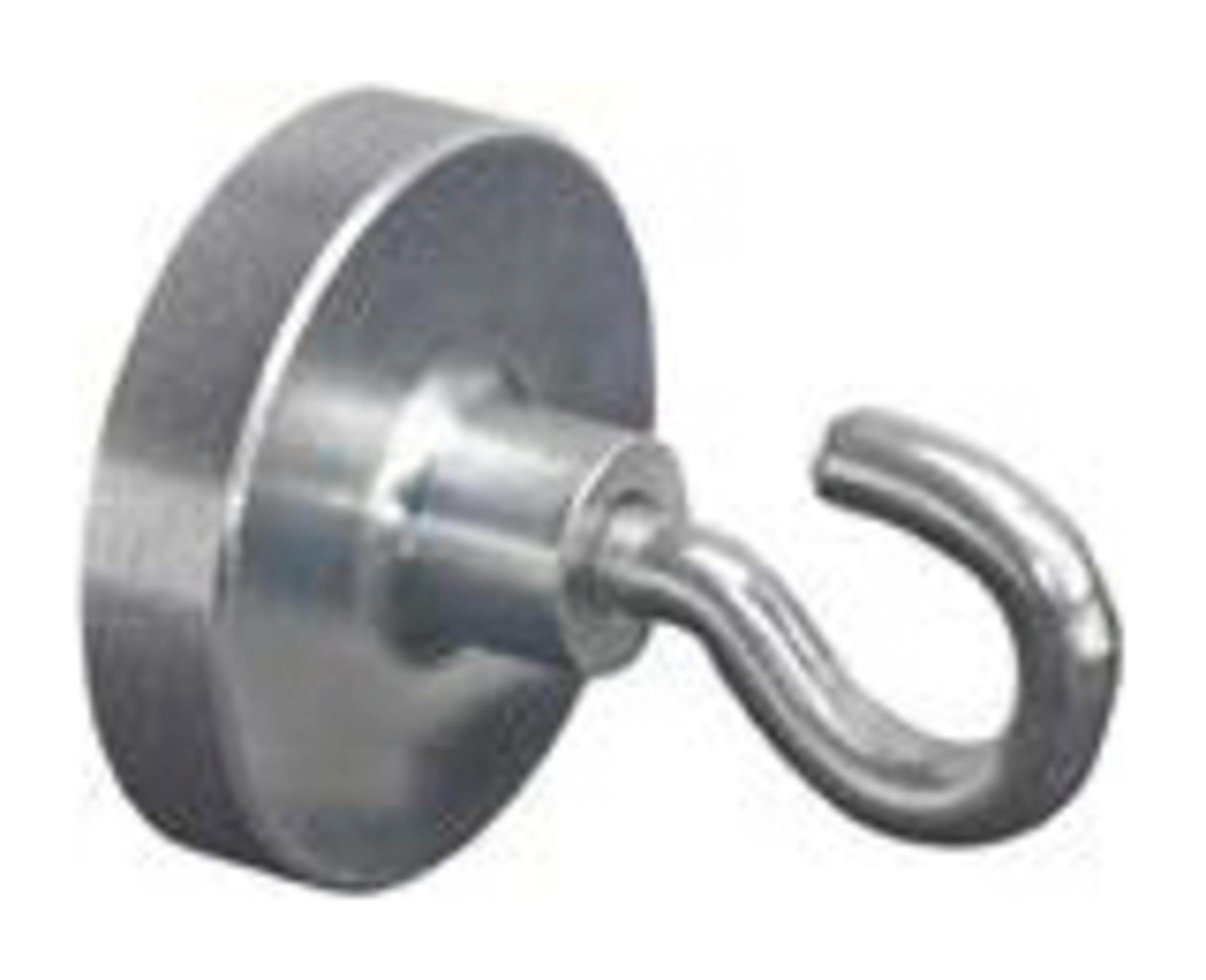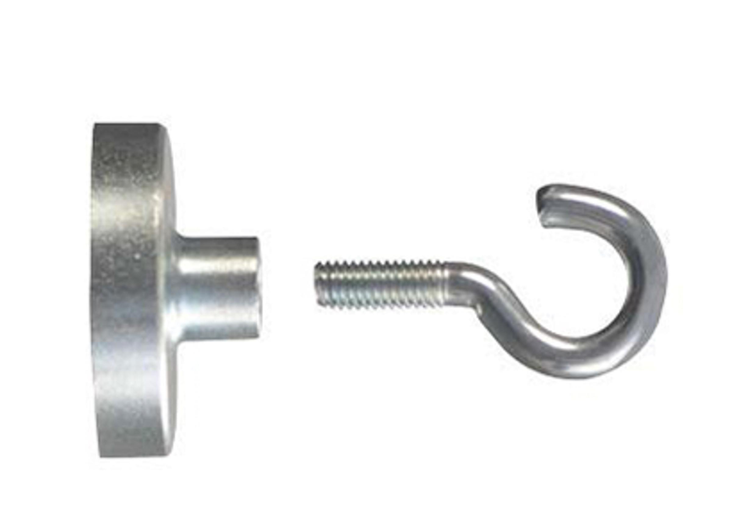 Mit einer Haftkraft von 9,5 kg (Ø 16 x 4,5 mm) bis 35 kg (Ø 32 x 7 mm) lässt sich dieser starke Organisationshelfer überall dort einsetzen, wo ein Haken benötigt wird − ohne Bohren, Schrauben oder Kleben. Das Gehäuse mit Gewindebuchse (Gewindegröße M4/M5) besteht aus verzinktem Stahl. Den besten Halt erzielt man beim direkten Aufsetzen auf Metall, der Hakenmagnet ist darüber hinaus auch für magnetische Glasboards geprüft und geeignet.