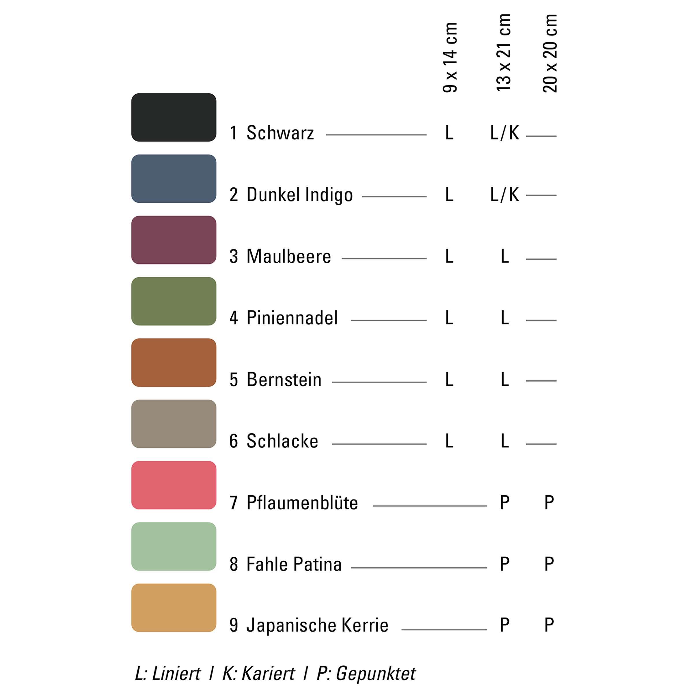 Farbnr.: 1 = Schwarz, 2 = Dunkel Indigo, 3 = Maulbeere, 4 = Piniennadel, 5 = Bernstein, 6 = Schlacke, 7 = Pflaumenblüte, 8 = Fahle Patina, 9 = Japanischer Kerri