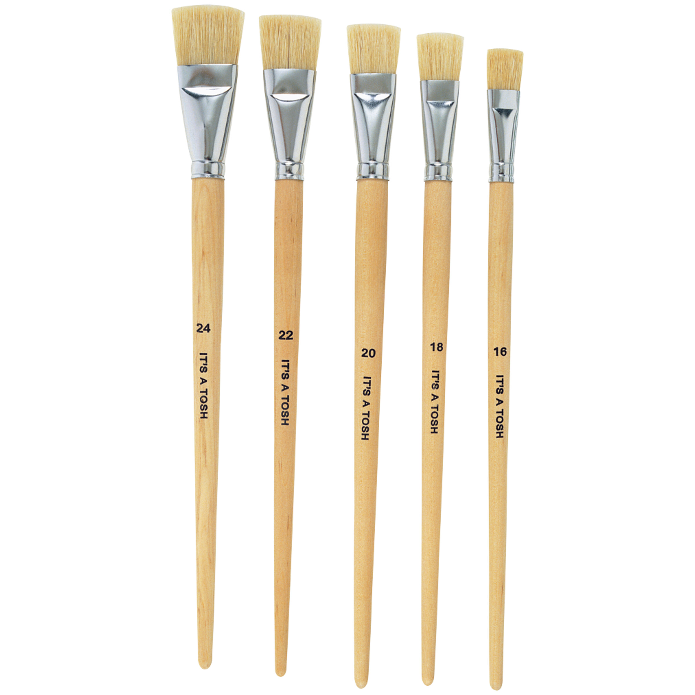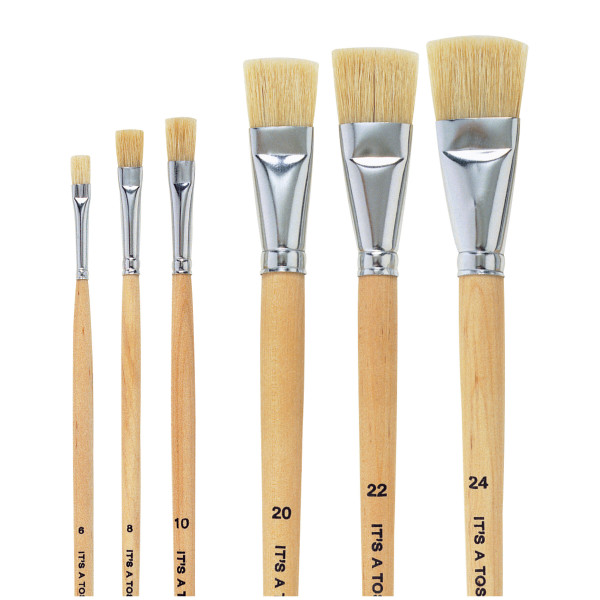 Flachpinsel in Einzelgrößen, lieferbar in Packungen à 12 Stück. Weiße Borsten, nahtlose Aluminiumzwinge, langer Naturholzstiel.