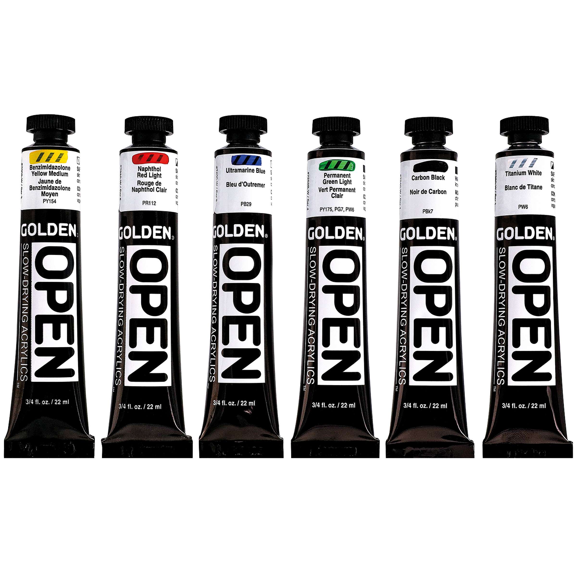 Das Set enthält die Farbtöne Benzimidazolone Yellow Medium, Naphthol Red Light, Ultramarine Blue, Permanent Green Light, Carbon Black und Titanium White sowie 30 ml Open Thinner (Verdünner).
