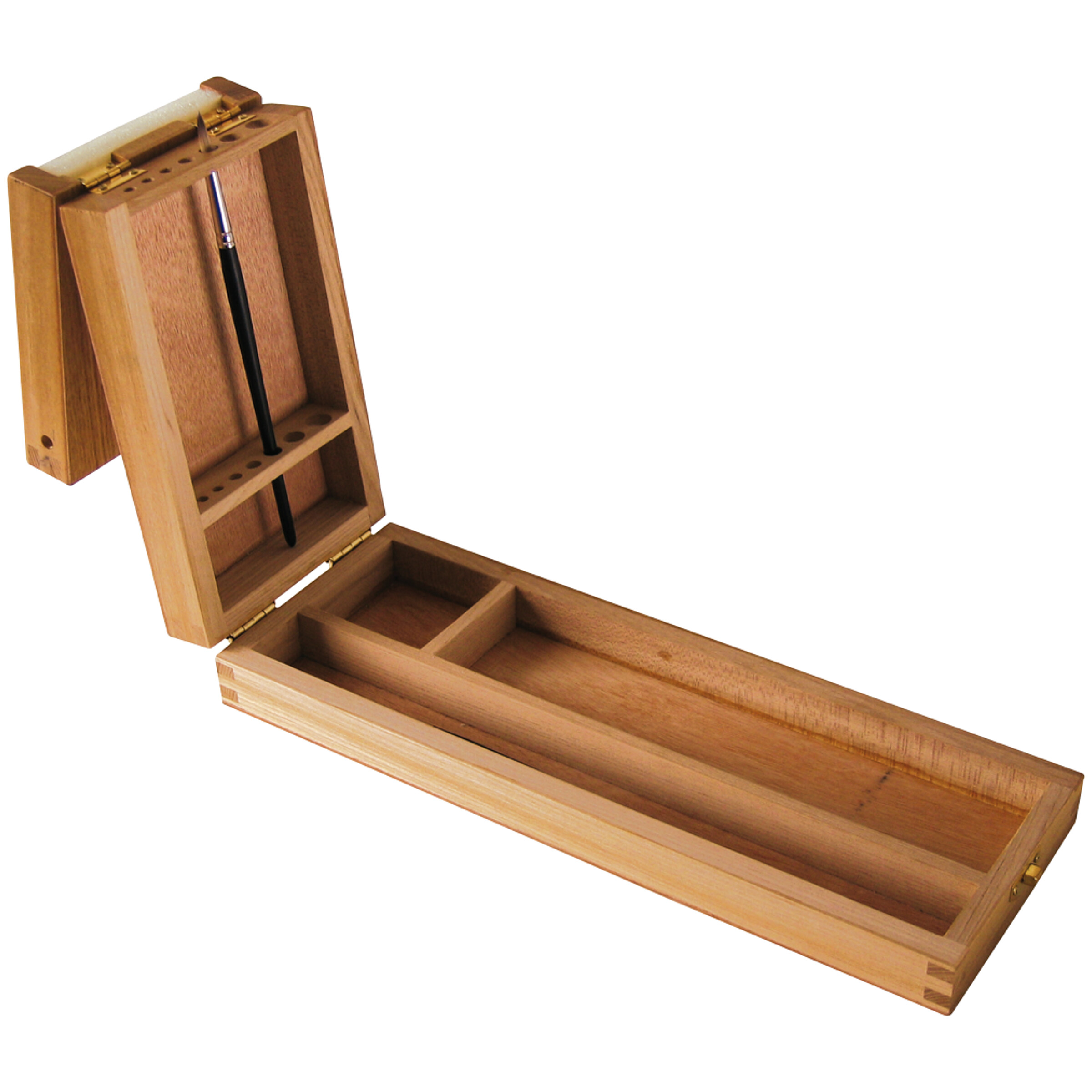 Pinsel lassen sich griffbereit aufbewahren, da der Deckel sich abwinkeln und aufstellen lässt. Die stabile Pinselbox aus Ulmenholz ist durch geschraubte Messingbeschläge sicher verschließbar. Ohne Inhalt.