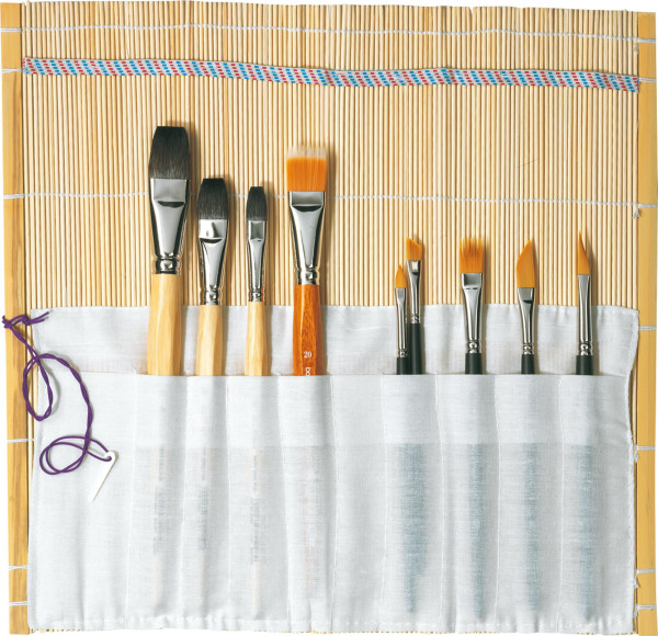Aus stabilem Peddig gefertigt und an den äußeren Rändern durch breite Bambusstäbe verstärkt. Die aufgenähte Baumwolltasche hat 10 Pinselfächer unterschiedlicher Breite. Ein praktisches Gummiband schützt die Pinsel vor dem Herausfallen....