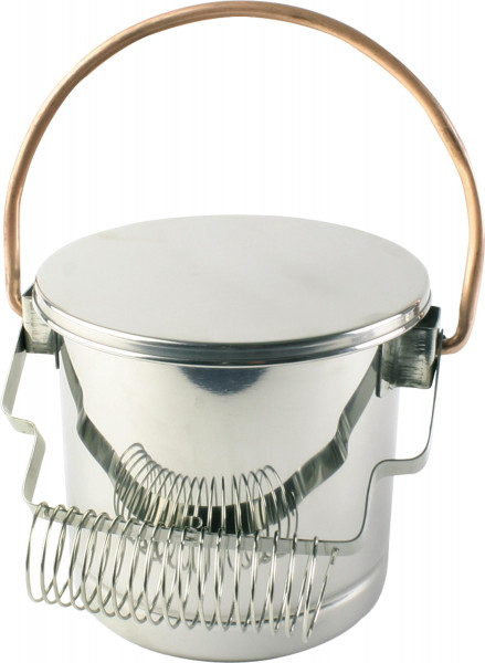 Großer, funktionaler, stabiler Pinselwascher mit Deckel und Transportbügel. Die Pinsel klemmen in einer fest justierbaren Spirale und können hierdurch frei im Lösungsmittel (z. B. Terpentin, Nitroverdünnung usw.) hängen. Die Farbrückstände sickern durch einen Siebeinsatz (Höhe ca. 4 cm), der mittels eines Bügels leicht aus dem Eimer zu heben ist, auf den Gefäßboden. Der Pinselwascher ist nicht für Wasser geeignet! Höhe 23 cm, Ø 15 cm.