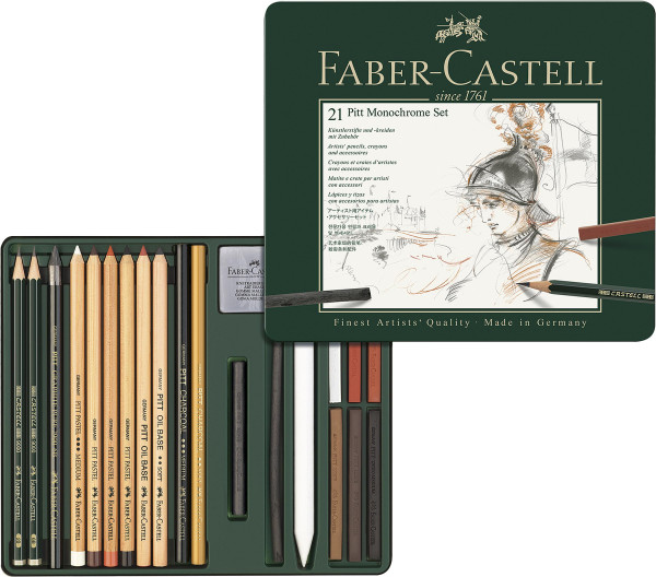 Enthalten sind 2 Bleistifte Castell 9000 2B, 6B, 1 Pitt Graphite Pure Stift 6B, 2 fetthaltige Pitt Oil Base Künstlerstifte, 4 fettfreie Pitt Pastellstifte, 6 fettfreie Pitt Pastellkreiden, 1 Pitt Reißkohlestick, 1 Pitt Zeichenkohlestick, 1 Pitt Zeichenkohlestift, 1 Pitt Reißkohlestift, 1 Knetradierer, 1 Papierwischer.