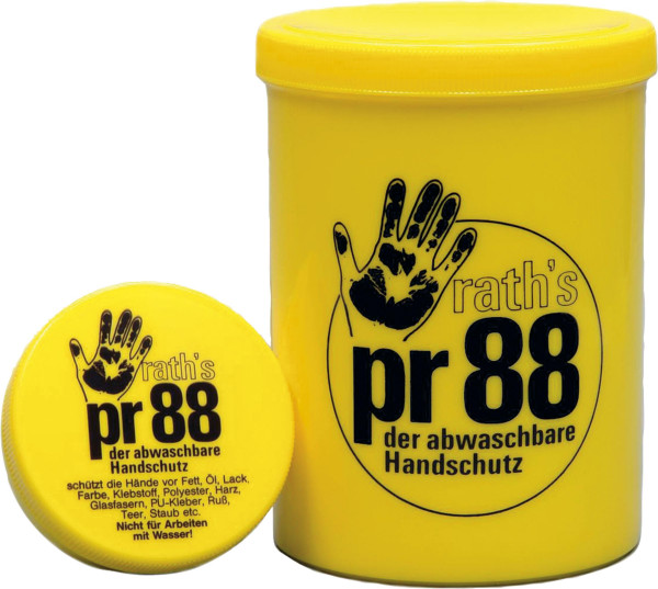 Ein abwaschbarer Handschutz, der den Schmutz erst gar nicht an die Hände heranlässt! Pr88 schützt die Haut vor Farbe, Fett, Öl, Lack, Teer, Klebstoff, Harzen, Silikonmassen, PU-Kleber, Ruß, Stäuben usw. Pr88 ist wasserlöslich. Die Hände werden vor der Arbeit mit Pr88 eingecremt; es bildet sich ein unsichtbarer Schutzfilm, der nach der Arbeit samt allen Verschmutzungen einfach abgespült wird. Im Gebrauch ist Pr88 sehr sparsam. Die 100 ml-Dose reicht für ca. 50 Anwendungen.