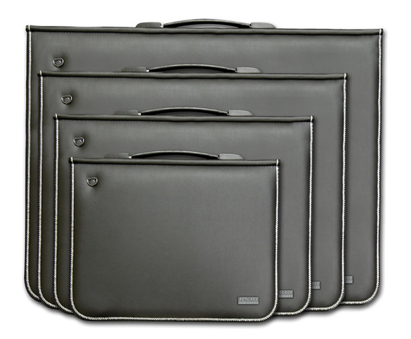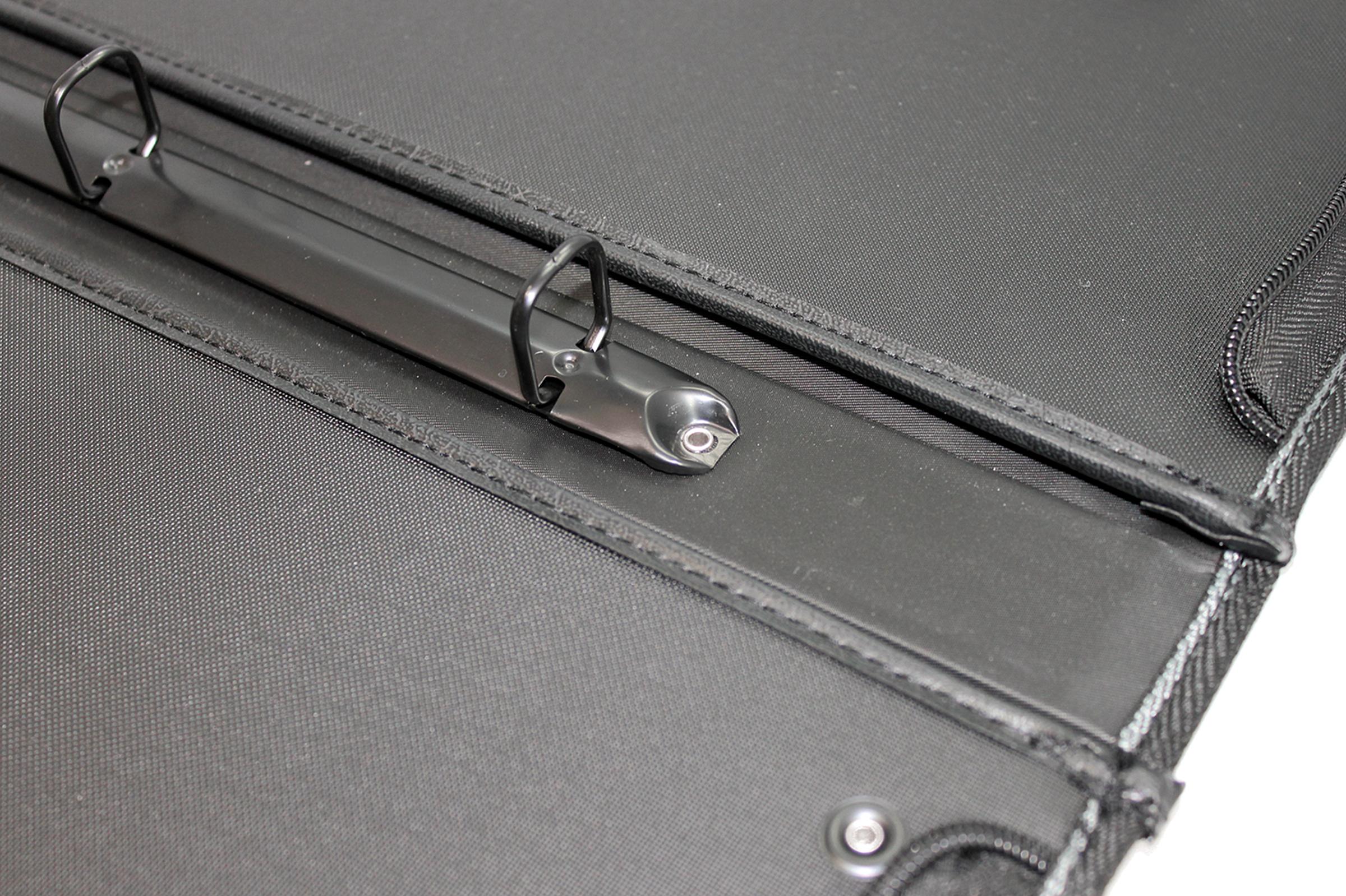 Mappe aus hochwertigem, weich gepolstertem und wasserabweisenden Kunstleder. Die integrierte Stahlplatte bietet größtmöglichen Schutz vor Beschädigung empfindlicher Arbeiten. Die Ringmechanik innen garantiert, dass Ihre Arbeiten in Tragerichtung senkrecht hängen. Innentaschen nehmen zusätzliches Infomaterial, Prospekte, Preislisten usw. auf. Bequemes Tragen der Mappen durch einen Griff, oder mit dem beiliegenden Schulterriemen.