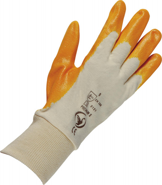 Bei den orangefarbenen Schutzhandschuhen mit Strickbund aus BW-Trikot sind Finger und Daumen NBR- beschichtet. Die Handschuhe sind ca. 27 cm lang, gefertigt nach EN 388, Kat. 2. Erhältlich in den Größen 7, 8, 9 und 10.