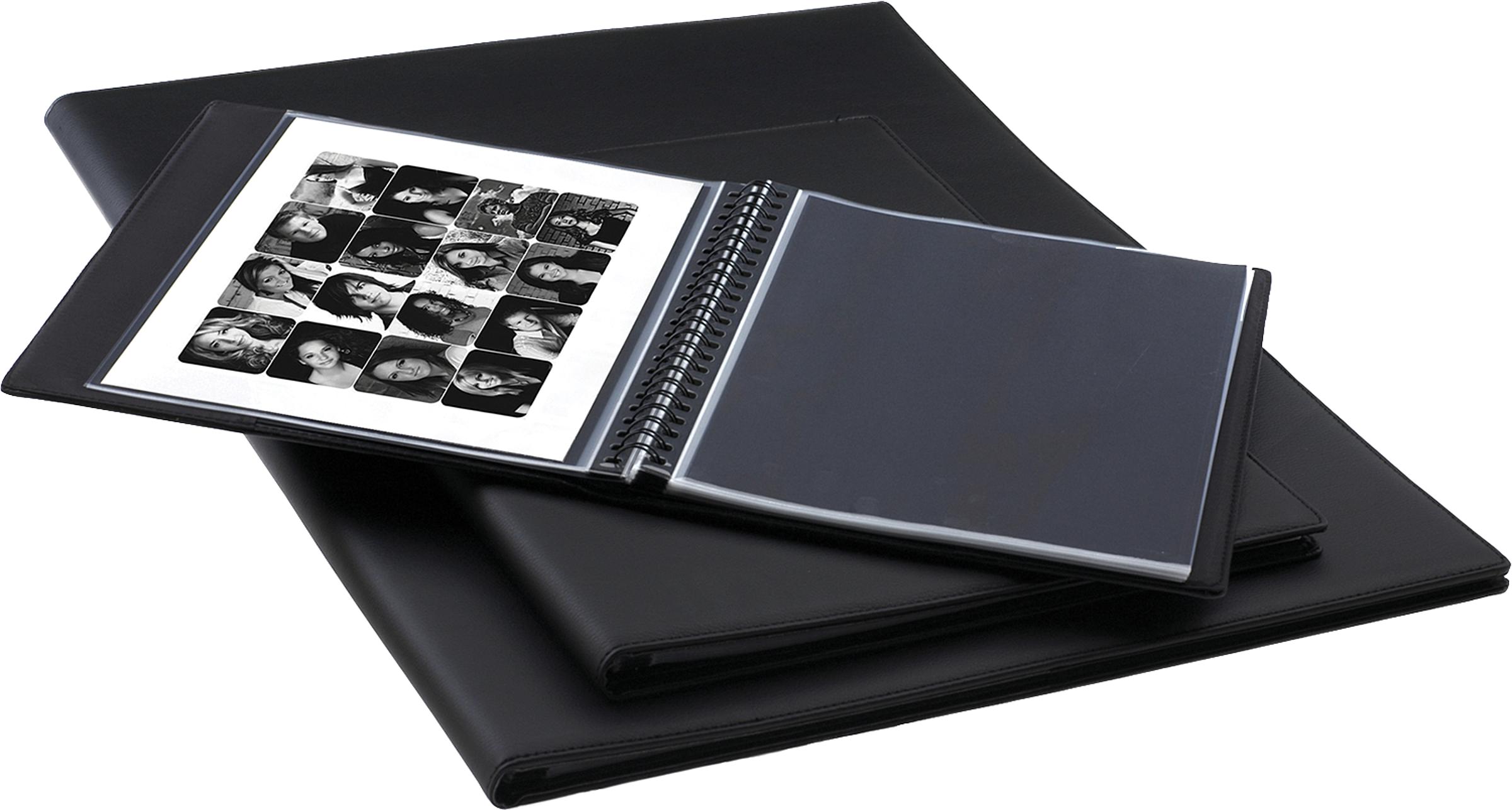 Album mit weicher Kunstleder-Oberfläche inkl. 20 Innenhüllen aus klarem Polypropylen in einer schwarzen Ringspirale.
