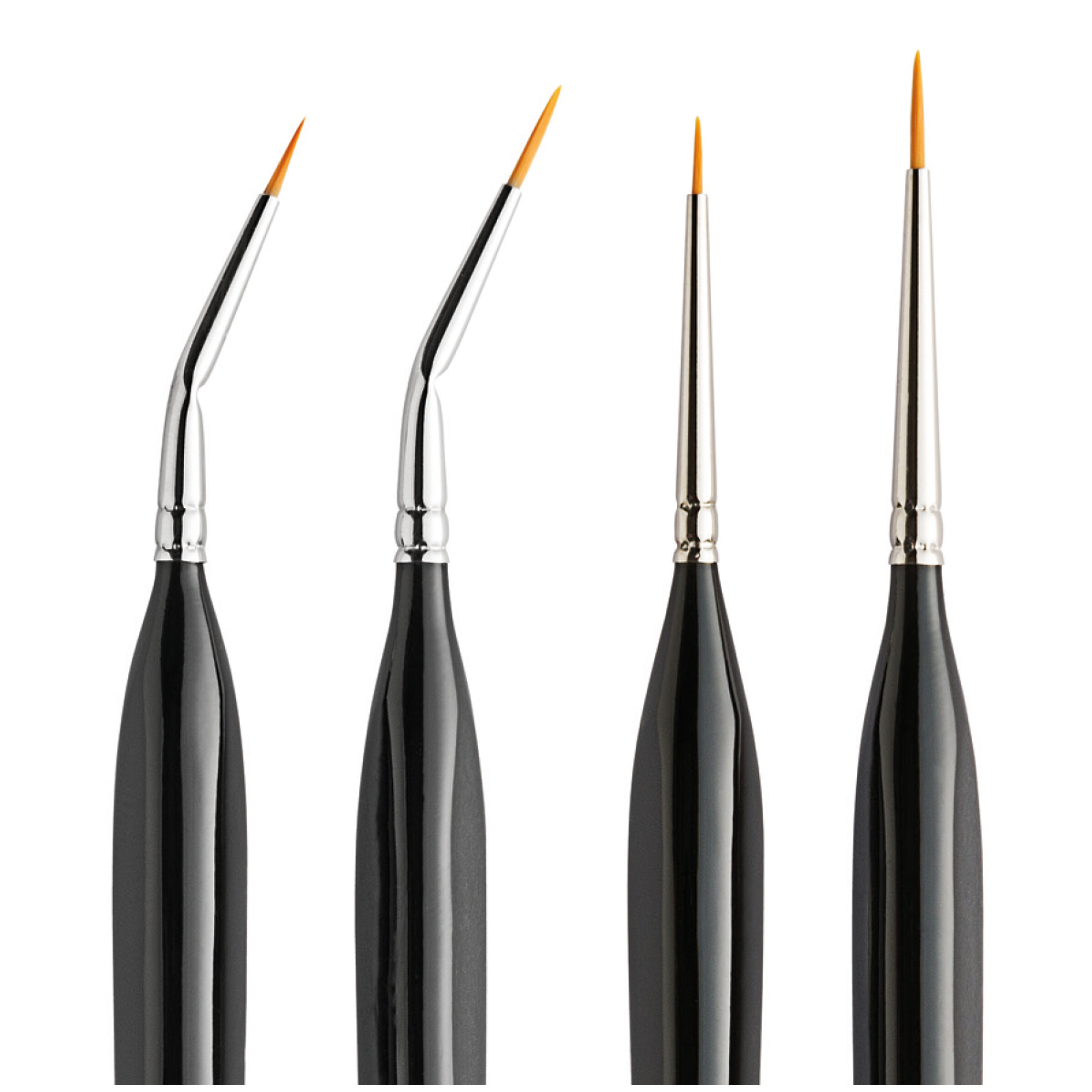 Speziell entwickelt für Miniaturen, feinste Detailarbeiten und Modellbau. Feinste Synthetikfasern sorgen für perfekte Spitzenbildung, Elastizität und Formbeständigkeit. Der ergonomisch dreieckig geformte, kurze Stiel ermöglicht eine sehr sichere Pinselführung. Mit der gebogenen Variante lassen sich auch schwer zugängliche Stellen gut erreichen und die Sicht wird nicht eingeschränkt. Made in Germany.