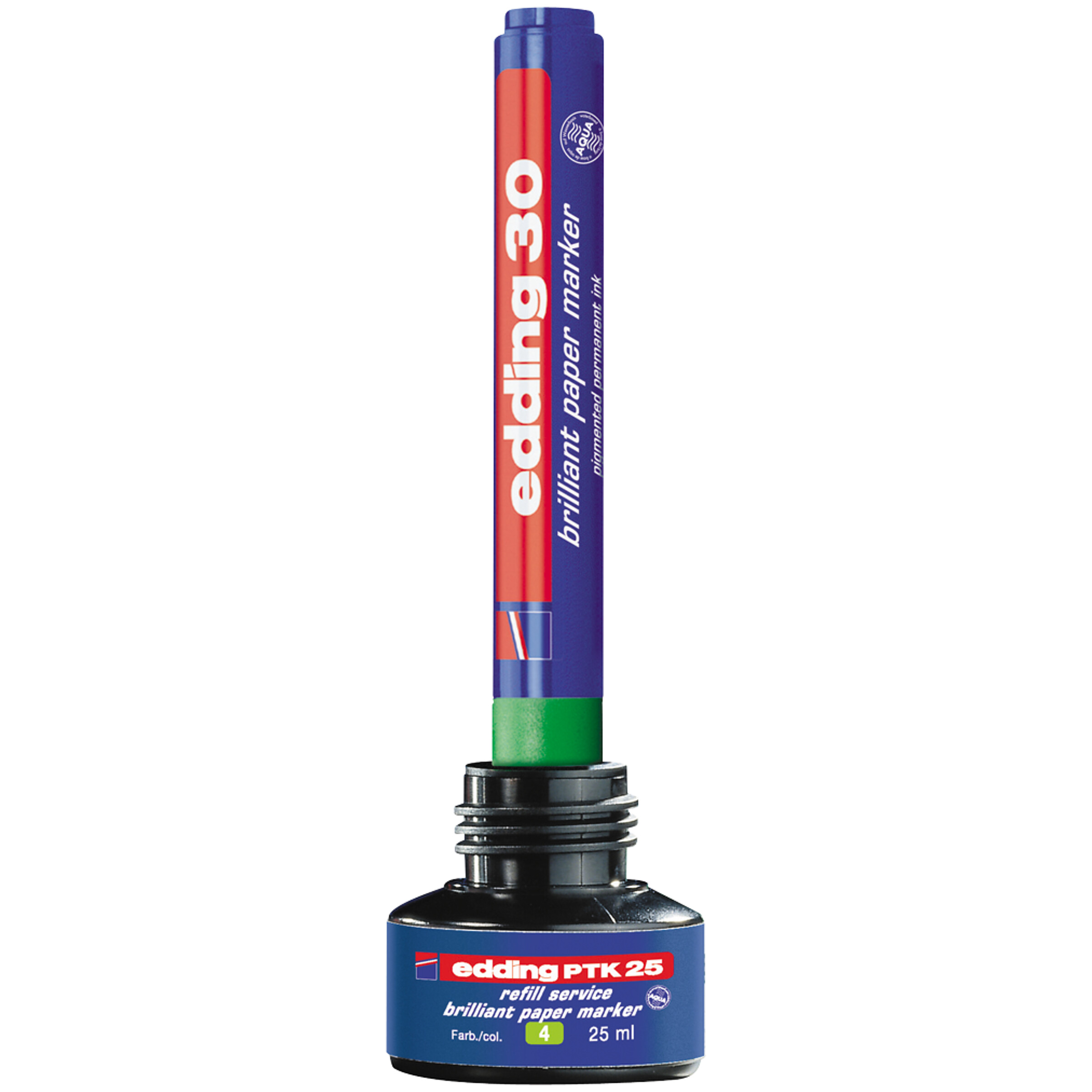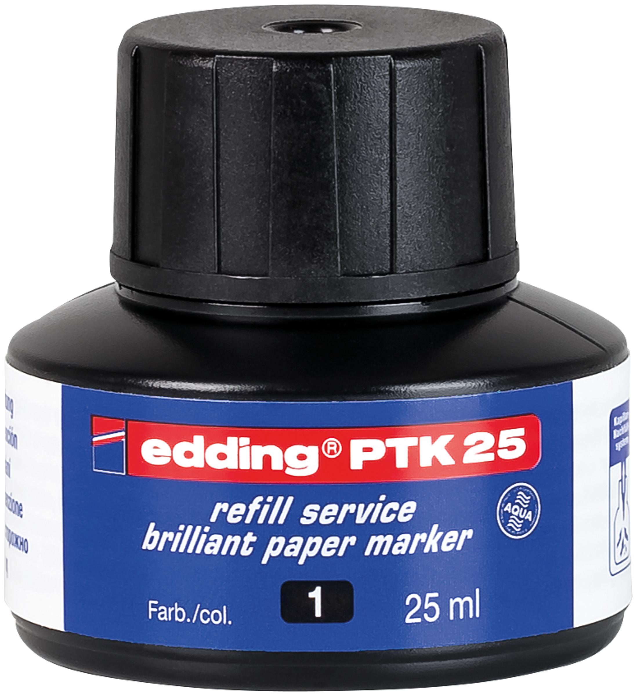 Brilliant Paper Marker Edding 30 oder 33 einfach mit der Spitze nach unten in die Refillflasche stecken. Durch ein Kapillarsystem füllt sich der Marker in ca. 1 Stunde selbst auf. Ein Sicherheitssystem vermeidet ein Herausfließen der Tusche. Farbtöne: 1 bis 4.