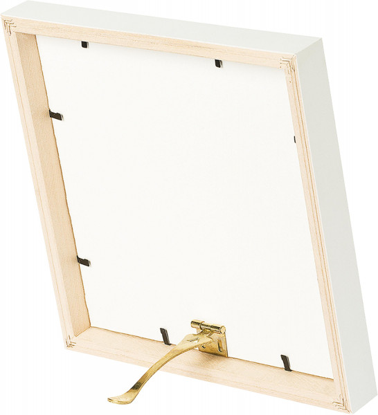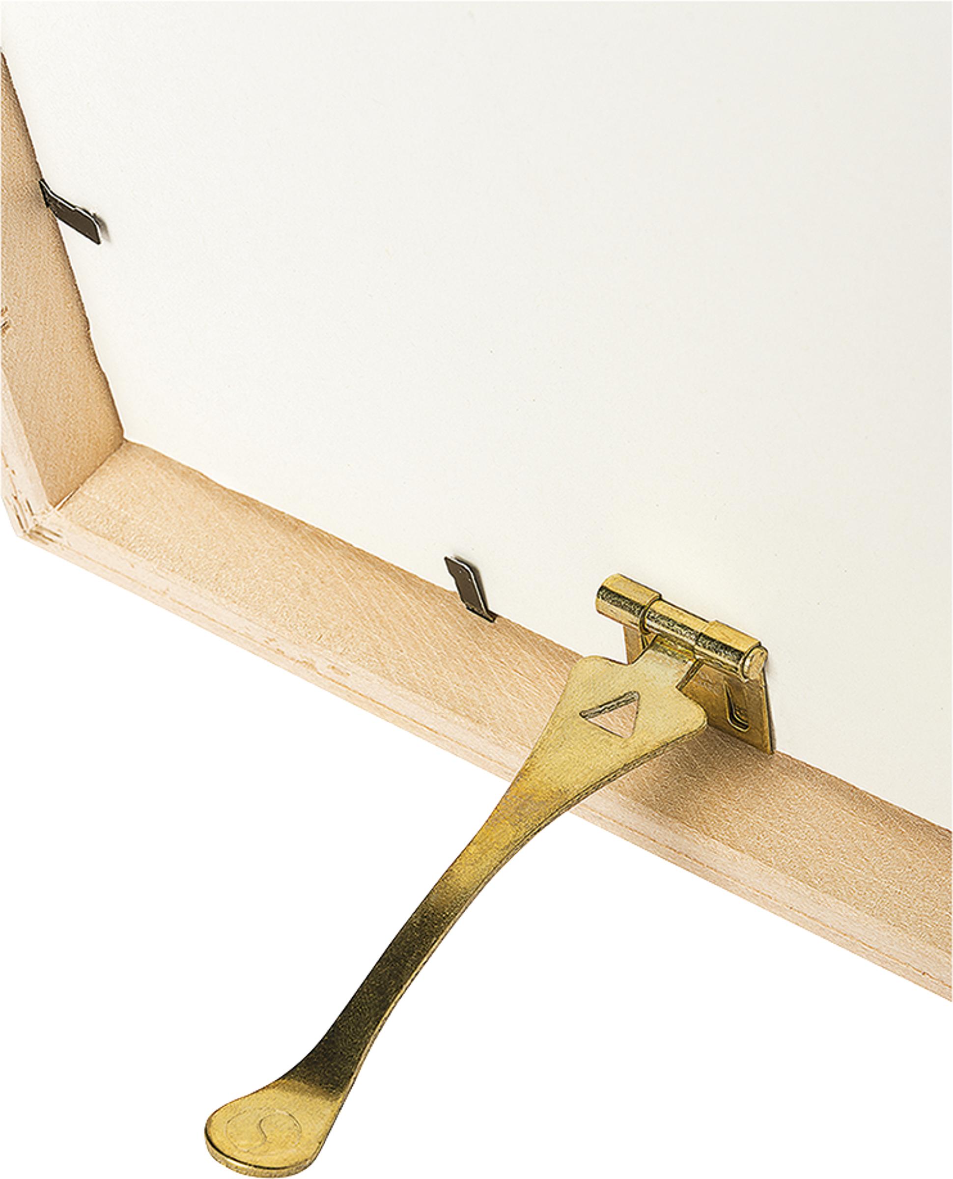 Stabiler, vermessingter Aufsteller zum Aufstecken auf Rahmenrückwände bis ca. 2,5 mm Stärke. Er ermöglicht das Aufstellen des Rahmens im Hoch- oder Querformat, der Neigungswinkel lässt sich dank des verstellbaren Bügels variieren. Erhältlich in zwei Größen, klein mit 9,5 cm Bügel und groß mit 12 cm Bügel.