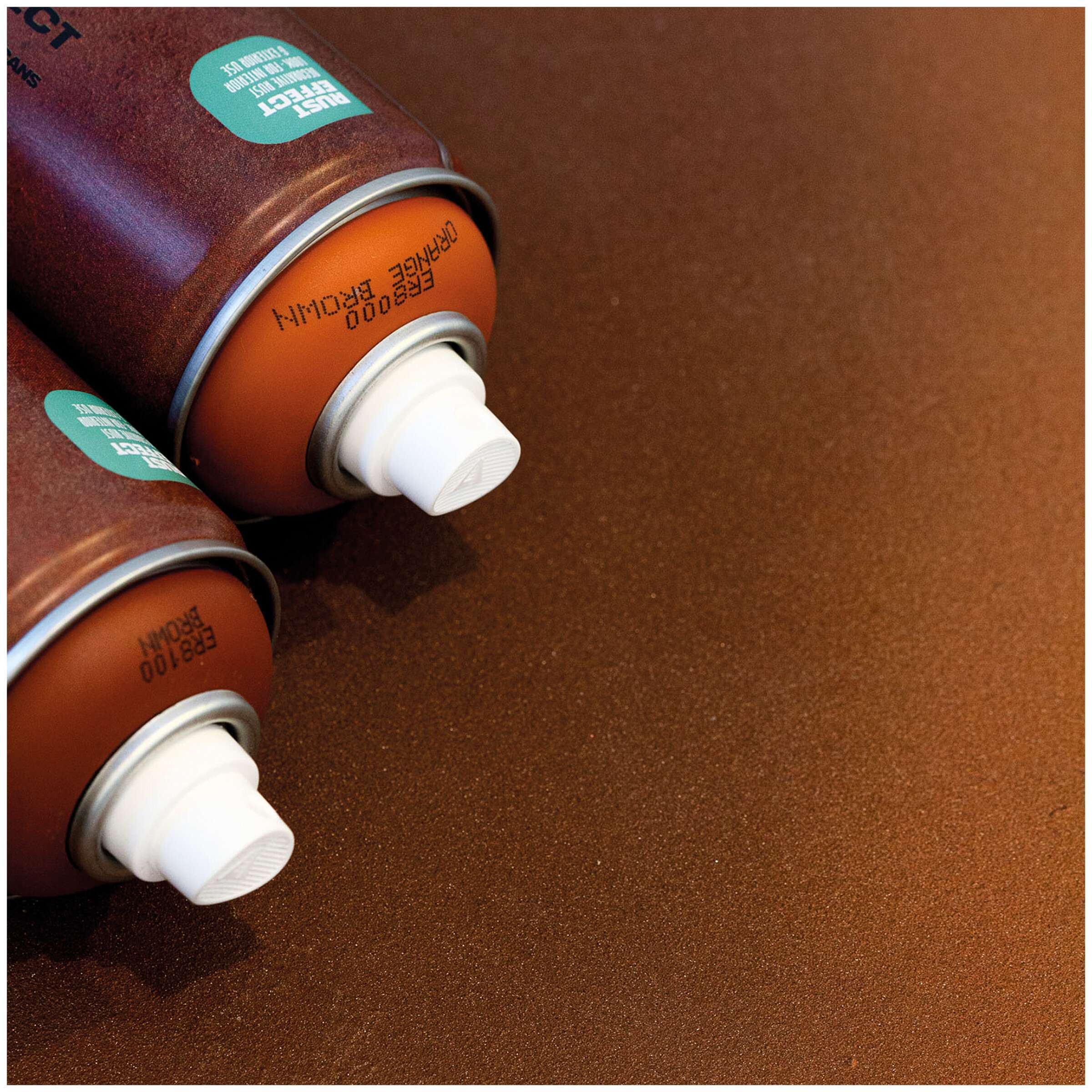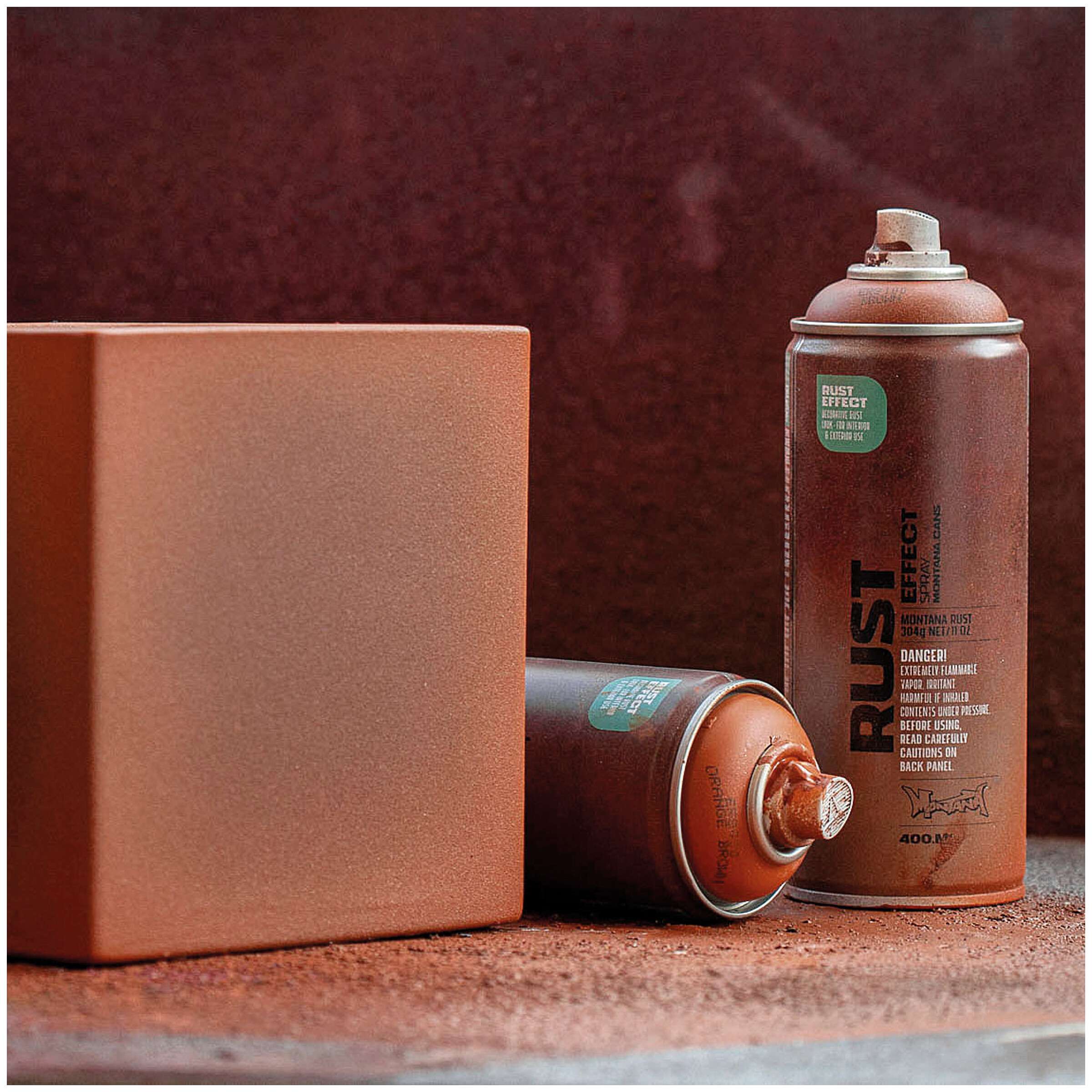 Der hochdeckende Sprühlack erzeugt eine authentische Rostoptik, die Oberflächen aussehen lässt, als seien sie auf natürliche Weise über einen langen Zeitraum oxidiert bzw. gealtert. Montana Rust Effect ist anwendbar auf Papier, Karton und grundierten Leinwänden. Auch auf Holz, Glas, Metall, Keramik, Porzellan, Stein und Acryl lassen sich mit dem Nitro-Kombi-Lack realistische Rosteffekte erzielen. Das Spray ist schnelltrocknend, witterungsbeständig und sowohl für Innen- als auch Außenbereiche geeignet. Erhältlich in den Farbtönen Orange Brown und Rust Brown, die wahlweise einzeln oder für ein organischeres Aussehen übereinander aufgetragen werden. Rust Effect kann nach vollständiger Trocknung mit Montana Gold, Montana Acrylic Markern und handelsüblichen Acrylfarben überstrichen und kombiniert werden.