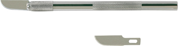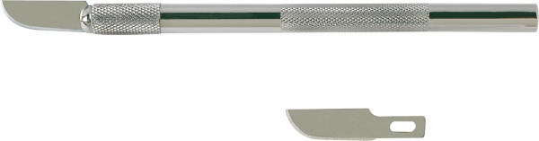 Schablonenmesser aus Leichtmetall inkl. Schutzkappe. Klinge mit beidseitig rundem Schliff zum Ausschneiden von schwierigen Formen (z. B. für Grafik und Beruf) aus Papier, Karton, Folie, Linoleum und ähnlichen Materialien. Inkl. zwei Rundschliff-Ersatzklingen. Länge 121 mm, Ø 8 mm.